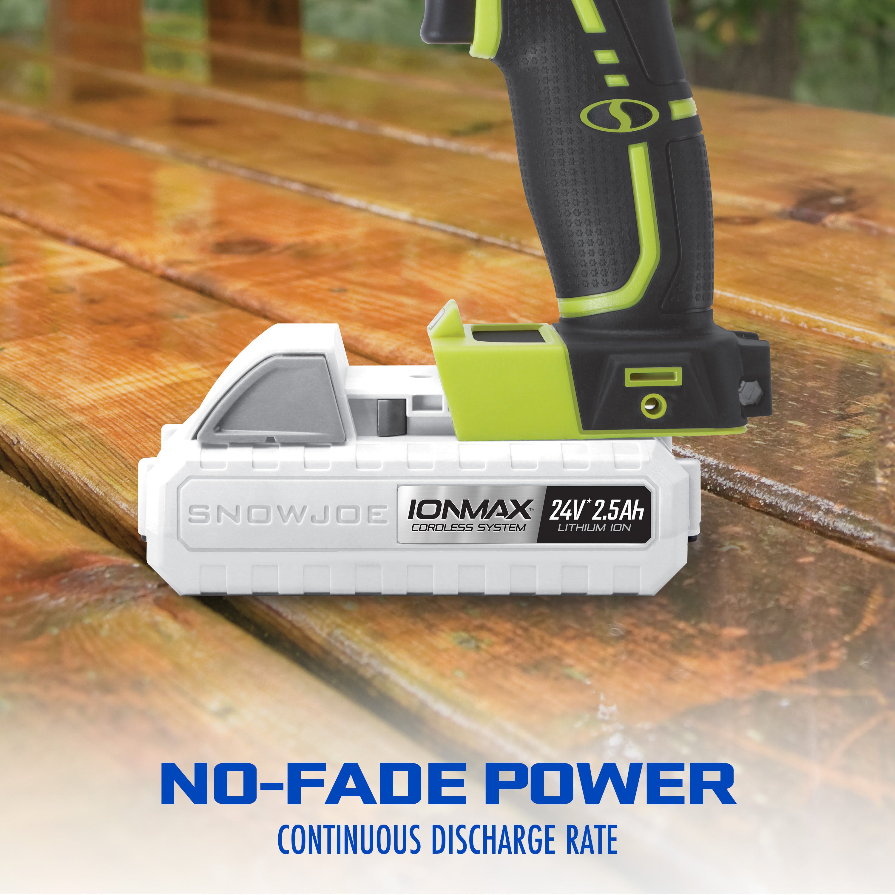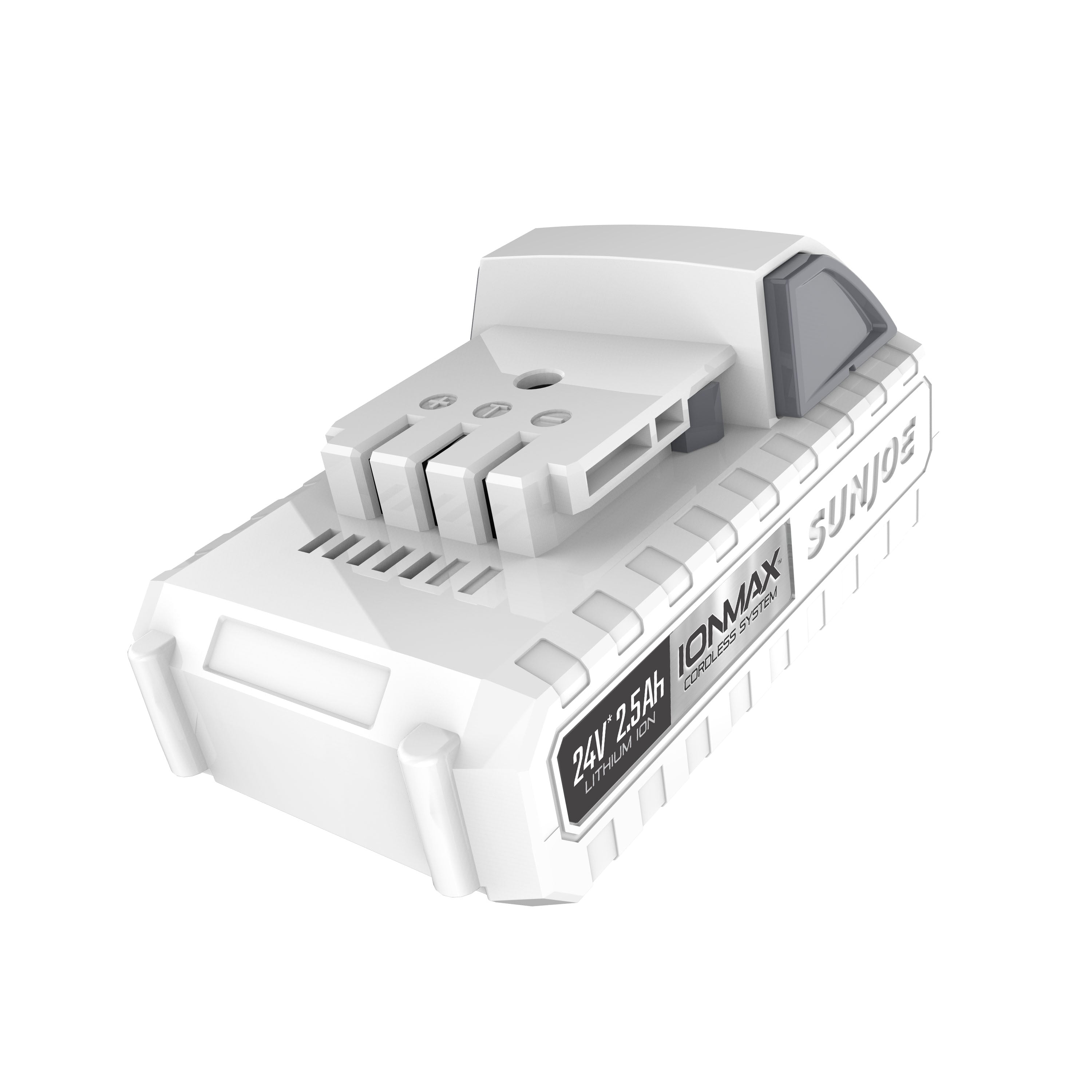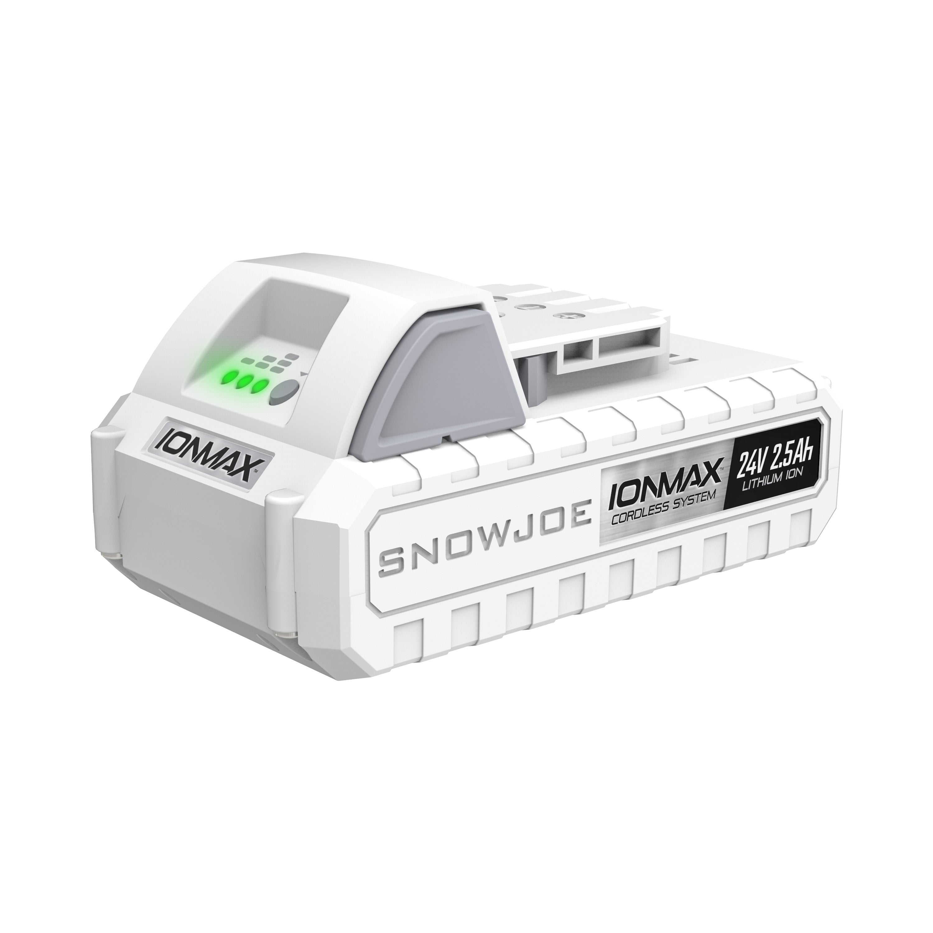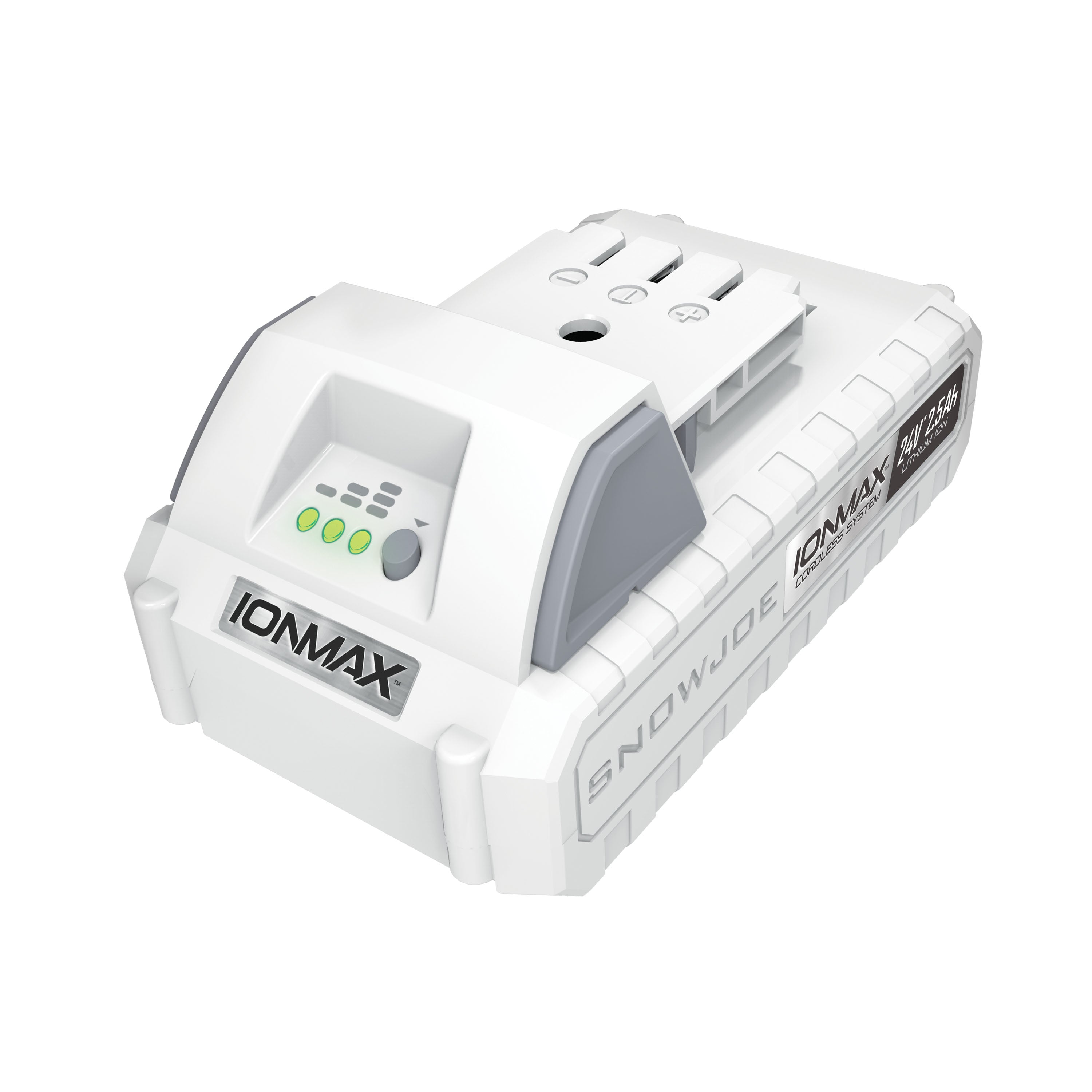 Power up. Power your cordless iONMAX tools with the 24-Volt* IONMAX 24VBAT-LT EcoSharp® lithium-ion battery. Compatible with all Snow Joe® + Sun Joe® 24V* IONMAX models, the 24VBAT-LT features high capacity 2.5 Ah lithium-ion cells that deliver no-fade power for maximum job performance.