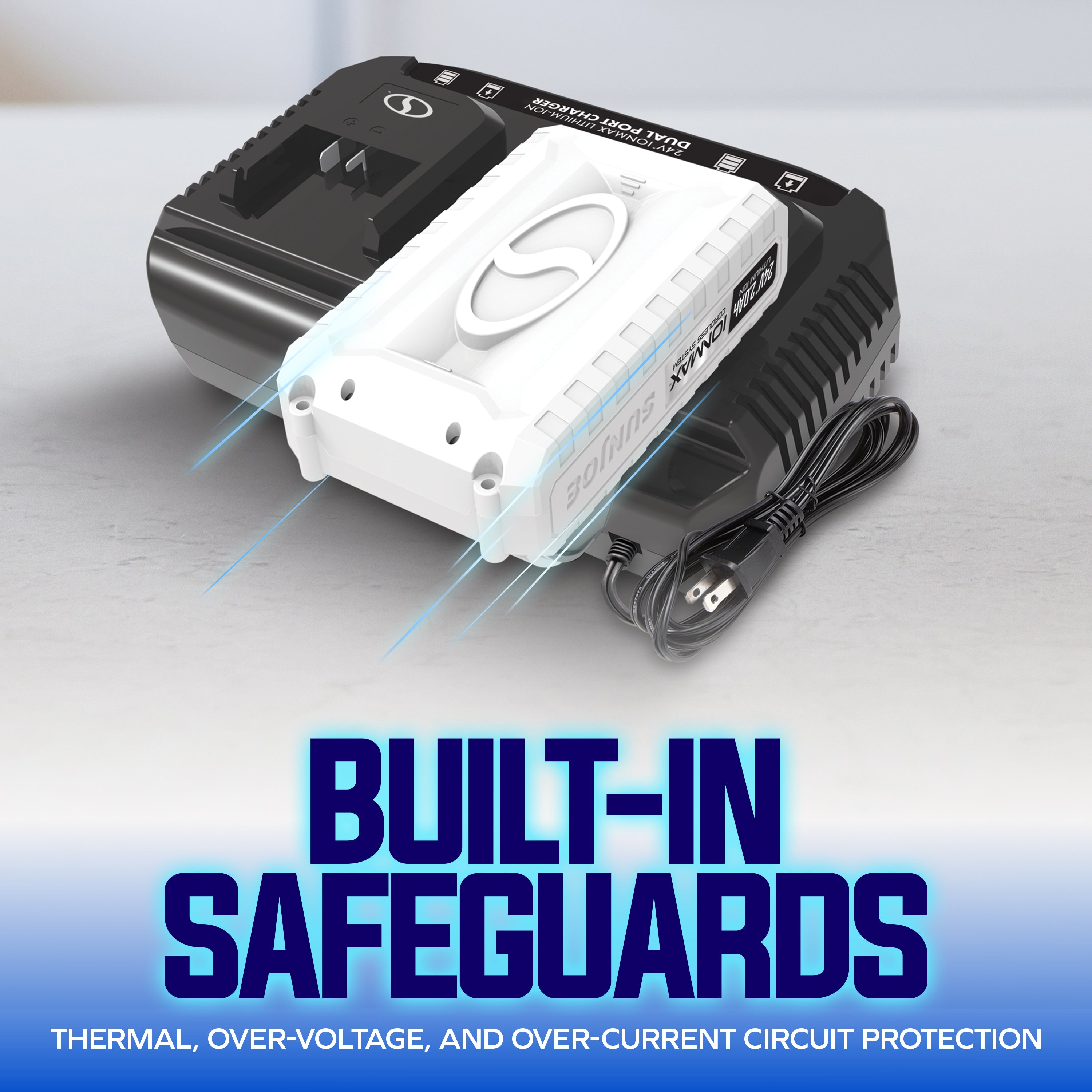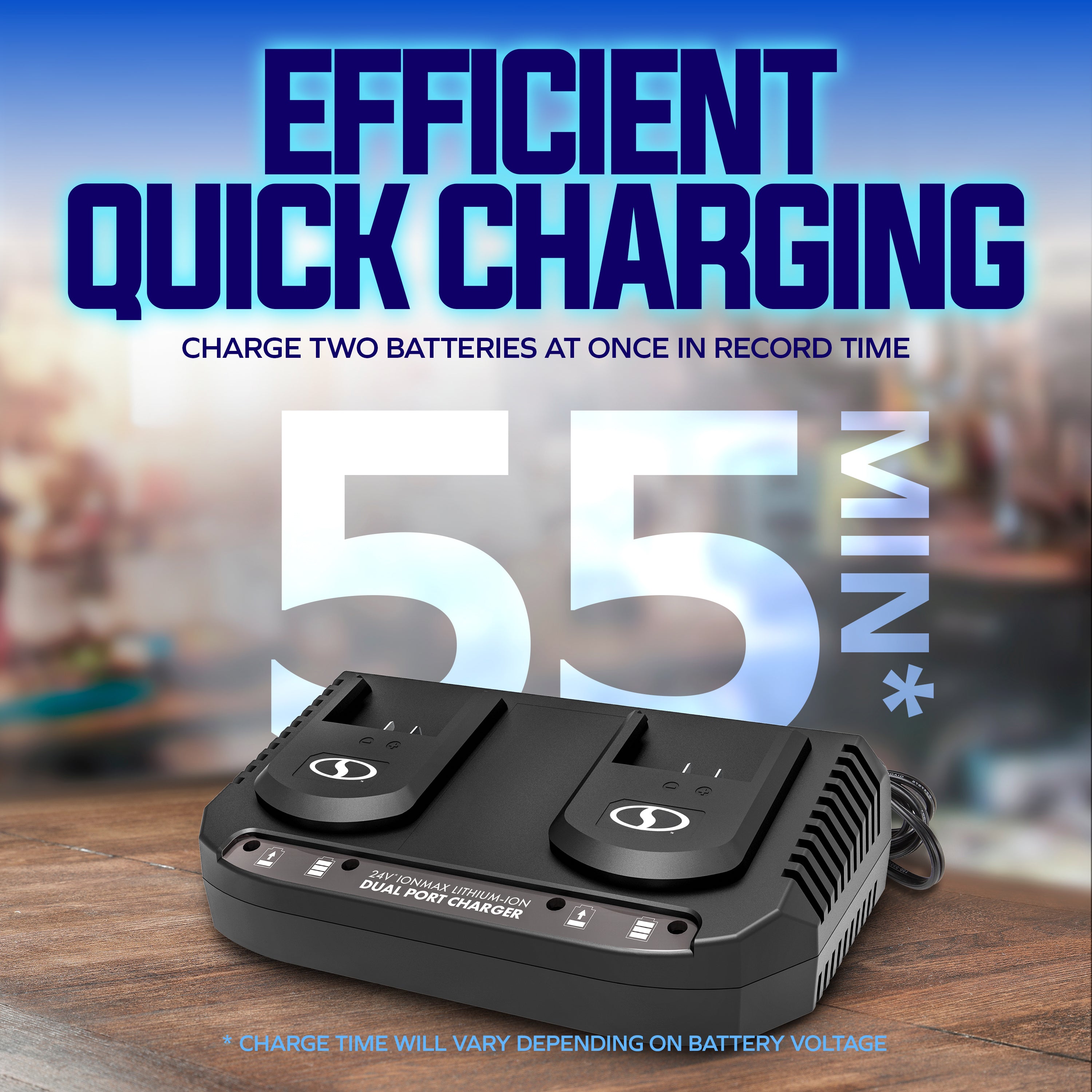 DOUBLE DUTY! Boost two batteries in less time with the 24VCHRG-DPC 24-Volt Dual-Port Charger! Designed to work exclusively with Snow Joe® + Sun Joe® IONMAX 24-Volt lithium-ion batteries, 24VCHRG-DPC charges up to two rechargeable IONMAX batteries in just 2.5 hours max. No more juggling two batteries on one charger - insert both and get back to business in less time! Equipped with thermal, over-voltage, and over-current circuit protection, 24VCHRG-DPC safely charges and recharges your IONMAX batteries without risk of battery damage. Cut the Cord®: charge up and work anywhere power is at a premium with the cordless convenience only a Snow Joe + Sun Joe dual port charger can provide!