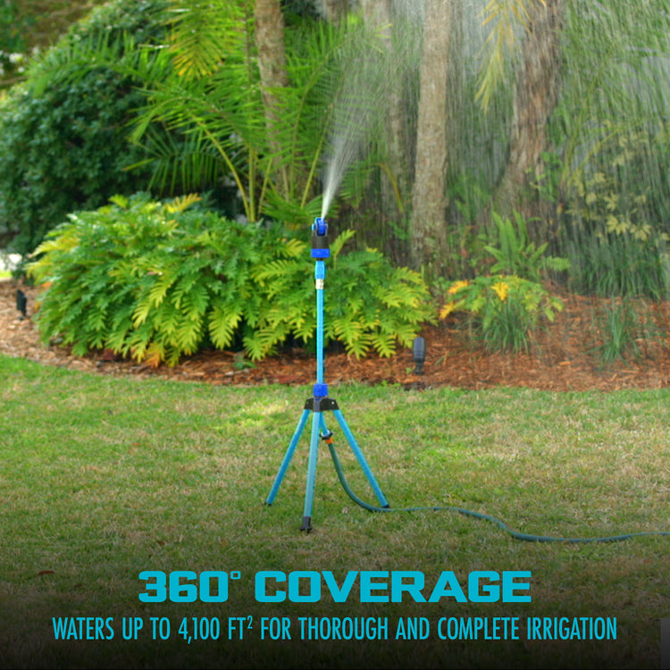 WATER YOUR WAY! Keep your garden green and your lawn lush with the Indestructible Turbo Drive 360° Telescoping Tripod Sprinkler/Mister from AQUA JOE®. Water up to 4,100 sq ft, with a spray of up to 72.2 ft in diameter for maximum coverage! The 6 adjustable spray patterns—flat, fan, large, multi, mini, and mist—and telescoping height adjustment let you perfectly customize your spray to suite the terrain. The rotating head can cover a full 360° for even water dispersal, and the heavy-duty, impact-resistant metal construction and leak-resistant hose connection will keep your garden well-watered, season after season. So, give your lawn a cool drink of water and Go With Joe®. The Indestructible 6-Pattern Turbo Drive 360 Degree Telescoping Tripod Sprinkler. GET EQUIPPED®.