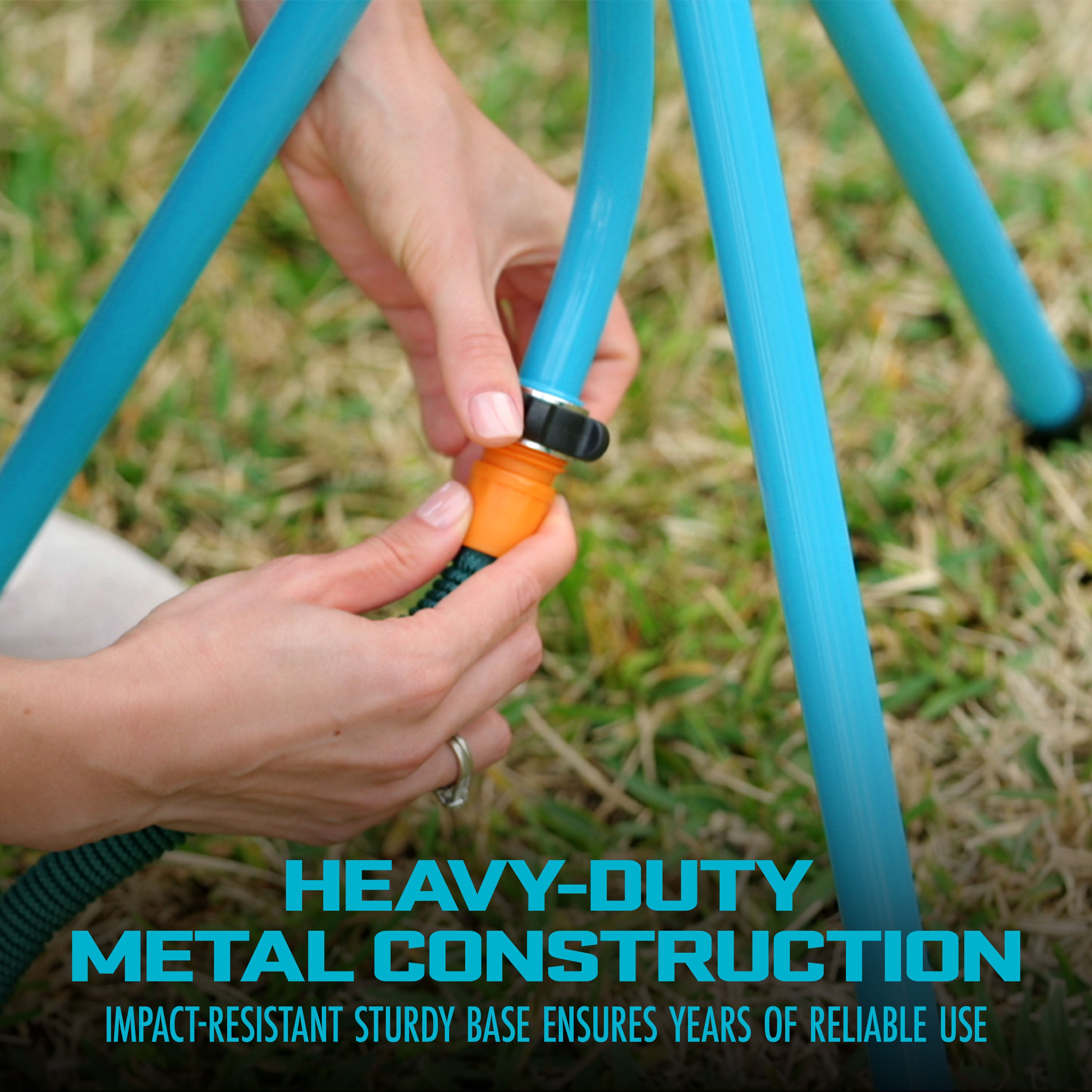 WATER YOUR WAY! Keep your garden green and your lawn lush with the Indestructible Turbo Drive 360° Telescoping Tripod Sprinkler/Mister from AQUA JOE®. Water up to 4,100 sq ft, with a spray of up to 72.2 ft in diameter for maximum coverage! The 6 adjustable spray patterns—flat, fan, large, multi, mini, and mist—and telescoping height adjustment let you perfectly customize your spray to suite the terrain. The rotating head can cover a full 360° for even water dispersal, and the heavy-duty, impact-resistant metal construction and leak-resistant hose connection will keep your garden well-watered, season after season. So, give your lawn a cool drink of water and Go With Joe®. The Indestructible 6-Pattern Turbo Drive 360 Degree Telescoping Tripod Sprinkler. GET EQUIPPED®.