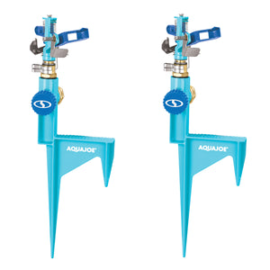 SPRAY YOUR WAY! Make sure your yard + garden stay green, lush, and healthy with the Aqua Joe® 2-pack AJ-ISH-2PK Indestructible Zinc Impulse 360° Sprinkler. AQUA JOE features 1400-sq-ft max coverage, a 42-ft max spray diameter, and rugged rust- and weather-resistant zinc construction with a flow-through spike base that penetrates hard or dry soil and allows for multiple sprinkler connections in a series. Plus, CHOOSE YOUR COVERAGE® technology allows you to adjust from partial to full 360° coverage, and features distance, pattern, and rotation control. Fits the standard garden hose; 2-year warranty.