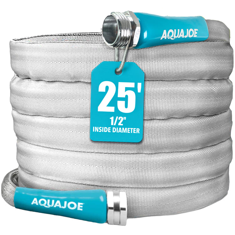 Say goodbye to tangled, kinked and heavy hoses with the XTREME FIBERJACKET GARDEN HOSE from AQUA JOE. Constructed from a rugged, marine grade fiber jacket surrounding a half in. flexible inner core, the rip and abrasion-resistant fabric is safe on delicate and painted surfaces - no scratching, scuffing or snagging. The innovative, dual-layer design is crush-proof and built to withstand the toughest treatment all while maintaining flexibility down to 35 ° Fahrenheit. Plus, AQUA JOE is weather and mildew resistant and dries quickly, so you don't have to pick up a heavy, wet or slippery hose. Equipped with durable metal fittings for a solid, leak-proof connection, AQUA JOE is kink-, twist- and tangle-resistant for uninterrupted flow when watering your yard or garden. AQUA JOE PRO features soft, flexible grips for maximum comfort during use. AQUA JOE is up to 50% lighter than conventional hoses, and provides maximum durability plus performance, and coils easily for compact storage. AQUA JOE comes in a variety of convenient lengths to fit any size lawn, auto, boat, garden and more.