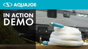WATER YOUR WAY! No more struggling to store a tangled, kinked, slimy, grimy hose on your RV, boat, or around your home, yard, garden and garage. The All-Purpose FiberJacket® Hose from AQUA JOE is the perfect irrigation accessory to take on-the-go. Constructed from a rugged, marine-grade fiber jacket surrounding a 5/8-inch flexible inner core, the rip and abrasion-resistant fabric is safe on delicate and painted surfaces — no scratching, scuffing or snagging! The innovative dual-layer design is crush proof, burst rated up to 600 PSI, and built to withstand the toughest treatment, all while maintaining flexibility down to 0º F. Equipped with durable aluminum fittings for a solid, leak-proof connection AQUA JOE is kink-, twist- and tangle-resistant for uninterrupted flow when filling your water tank, or watering your yard and garden. The soft, flexible non-slip grips provide maximum user comfort, and the FiberJacket® hose is up to 50% lighter than its conventional counterparts. AQUA JOE is weather and mildew resistant, dries quickly, and coils easily for compact storage after use. So, take the water where you want it — around the RV, boat, auto or garden — and Go With Joe®. The All-Purpose FiberJacket® Hose from AQUA JOE. GET EQUIPPED®.