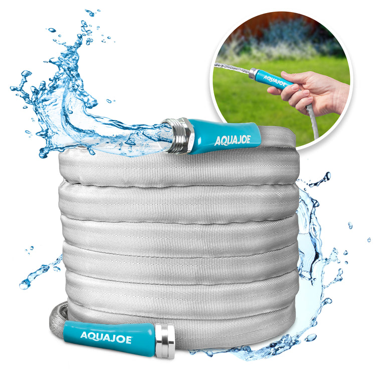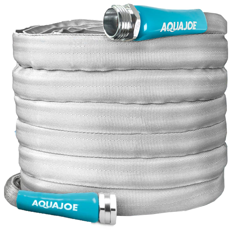 Say goodbye to tangled, kinked and heavy hoses with the XTREME FIBERJACKET GARDEN HOSE from AQUA JOE. Constructed from a rugged, marine grade fiber jacket surrounding a half in. flexible inner core, the rip and abrasion-resistant fabric is safe on delicate and painted surfaces - no scratching, scuffing or snagging. The innovative, dual-layer design is crush-proof and built to withstand the toughest treatment all while maintaining flexibility down to 35 ° Fahrenheit. Plus, AQUA JOE is weather and mildew resistant and dries quickly, so you don't have to pick up a heavy, wet or slippery hose. Equipped with durable metal fittings for a solid, leak-proof connection, AQUA JOE is kink-, twist- and tangle-resistant for uninterrupted flow when watering your yard or garden. AQUA JOE PRO features soft, flexible grips for maximum comfort during use. AQUA JOE is up to 50% lighter than conventional hoses, and provides maximum durability plus performance, and coils easily for compact storage. AQUA JOE comes in a variety of convenient lengths to fit any size lawn, auto, boat, garden and more.
