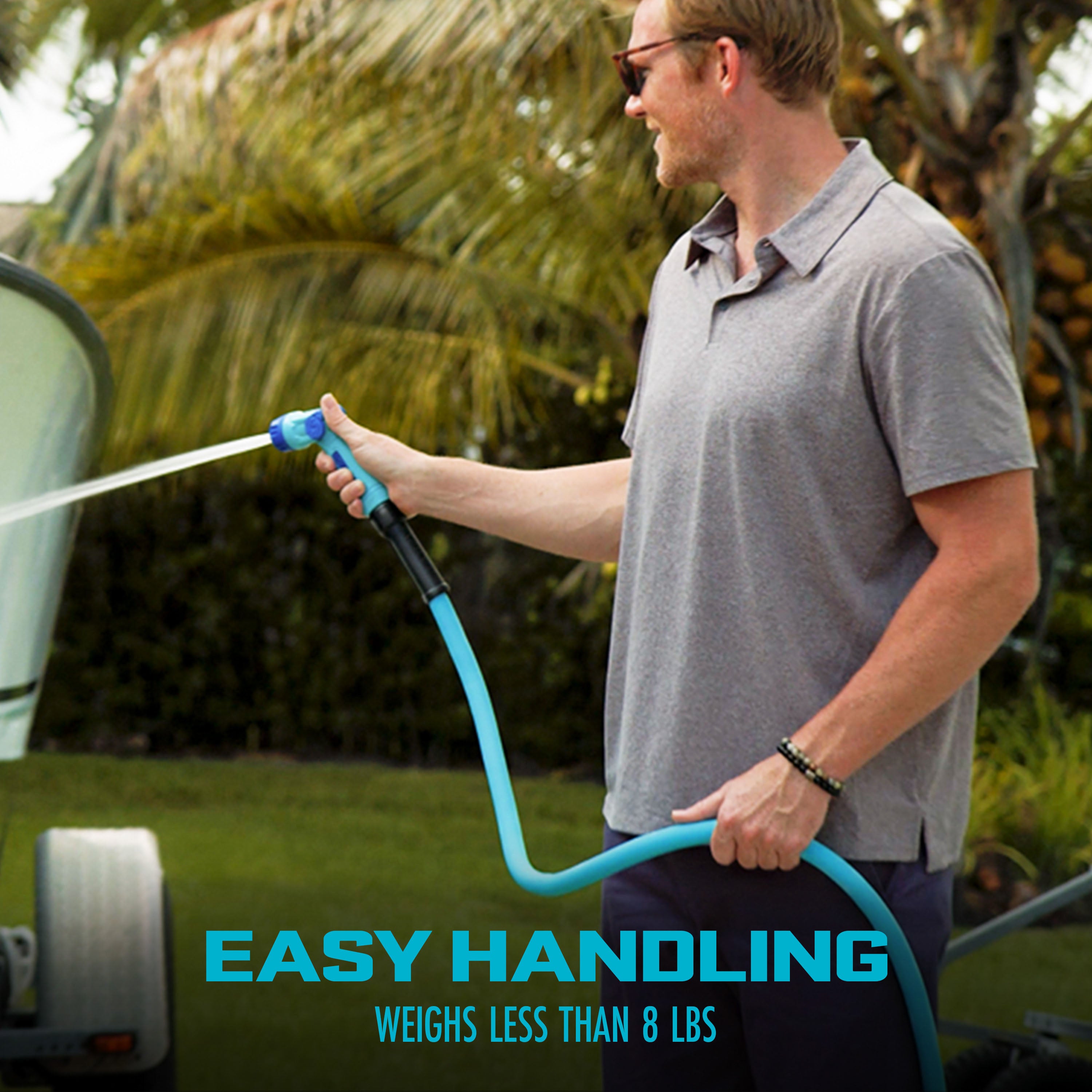 Water your lawn with uninterrupted flow with the AJPGH50-PRO Hybrid Polymer Garden Hose from Aqua Joe. Constructed from a rugged, high-density, flexible hybrid-polymer material for maximum durability performance. Lightweight and easy to maneuver around trees, corners, plants, and other obstacles, you can water your yard garden without having to stop and straighten the hose! Equipped with solid, male female aluminum connectors, Aqua Joe provides a secure, leak-proof connection. The heavy-duty end grips provides unrestricted flow without the worry of twisting at the spigot. The sturdy hybrid-polymer material is crush-proof and abrasion-resistant. So, give your lawn a cool drink of water with the AJPGH50-PRO 50-ft Hybrid Polymer Garden Hose from Aqua Joe.
