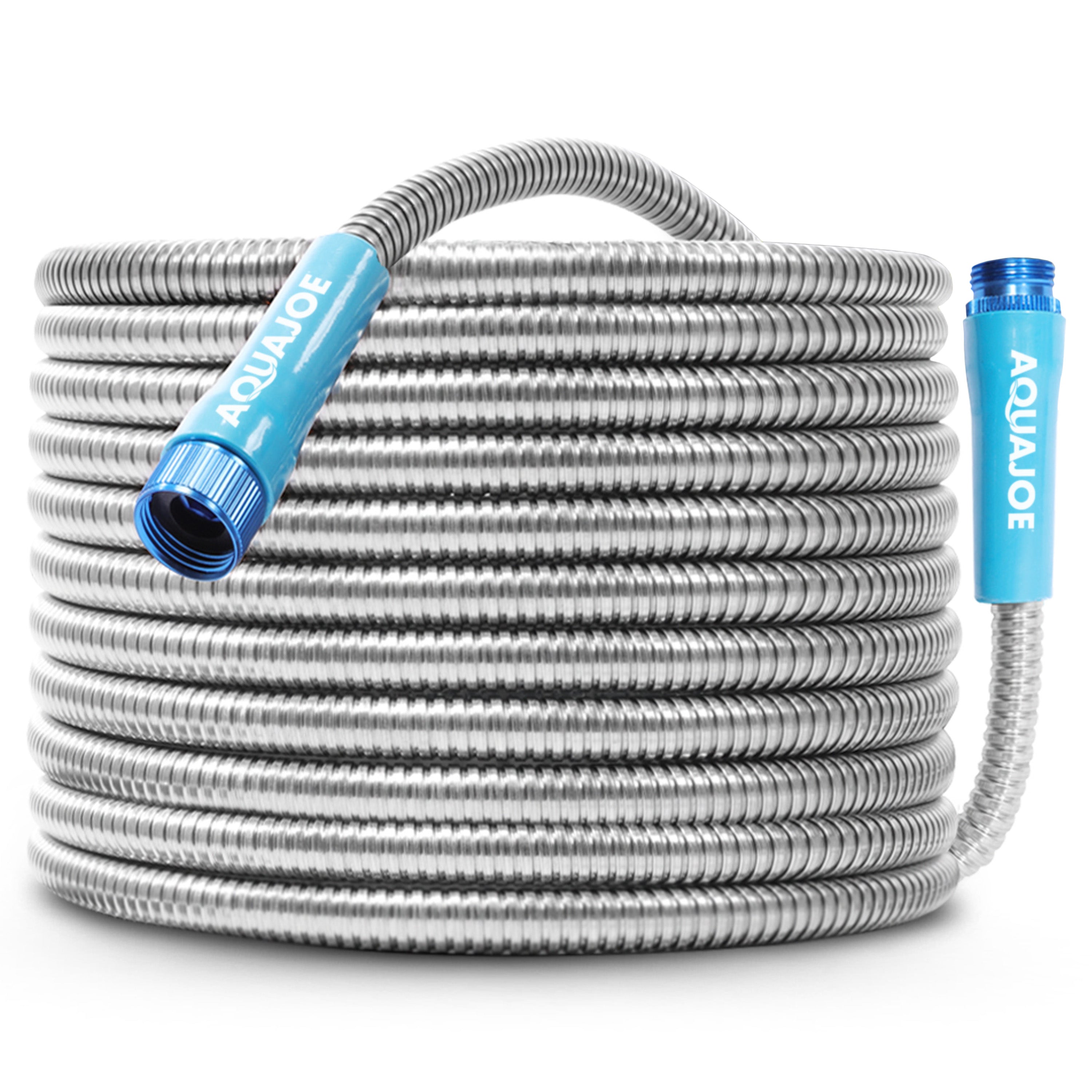 THE STAINLESS STEEL HOSE THAT’S AS TOUGH AS NAILS! AQUA JOE’s lightweight stainless steel hose is quite simply the last hose you’ll ever need! Made from high-quality industrial grade 304 stainless steel for a lifetime of reliable use in your yard and garden. Won’t cut, crush or crack - won’t split, kink or get hot in the sun. It’s the one hose that works as hard as you do. A rugged, virtually indestructible and puncture-proof stainless steel outer sheath surrounds a flexible PVC inner core, for maximum performance and durability, and features bend restrictor collars and durable aluminum fittings at each end for unrestricted water flow and secure, leak-proof connections. Perfect for watering the flowers, washing the truck, rinsing patio furniture or connecting to sprinkler or pressure washer.