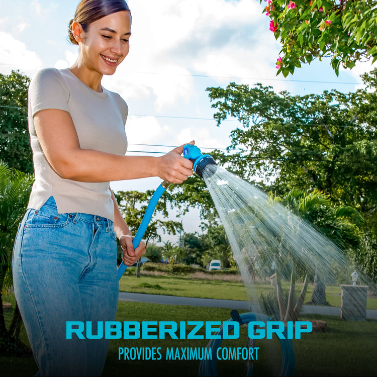 WATER YOUR WAY—ANYWHERE. This AQUA JOE® bundle pairs the rugged, go-anywhere All-Purpose FiberJacket® Hose with the heavy-duty Smart Throttle nozzle for a complete watering setup that’s lighter, tougher, and easier to use than traditional hose + nozzle combos. The hose features a marine-grade FiberJacket® outer sleeve wrapped around a flexible 5/8" inner core, so it resists kinks, twists, tangles, rips, and abrasion—while staying safe on delicate and painted surfaces. It also dries quickly, coils compactly, and stays flexible down to 0°F for reliable performance season after season. Finish the job with precision using the solid-metal nozzle, featuring Smart Throttle thumb control and 7 spray patterns—from powerful jet to gentle mist—so you can tackle everything from tank fills and rinsing to garden watering with a simple twist and slide. Go With Joe®.