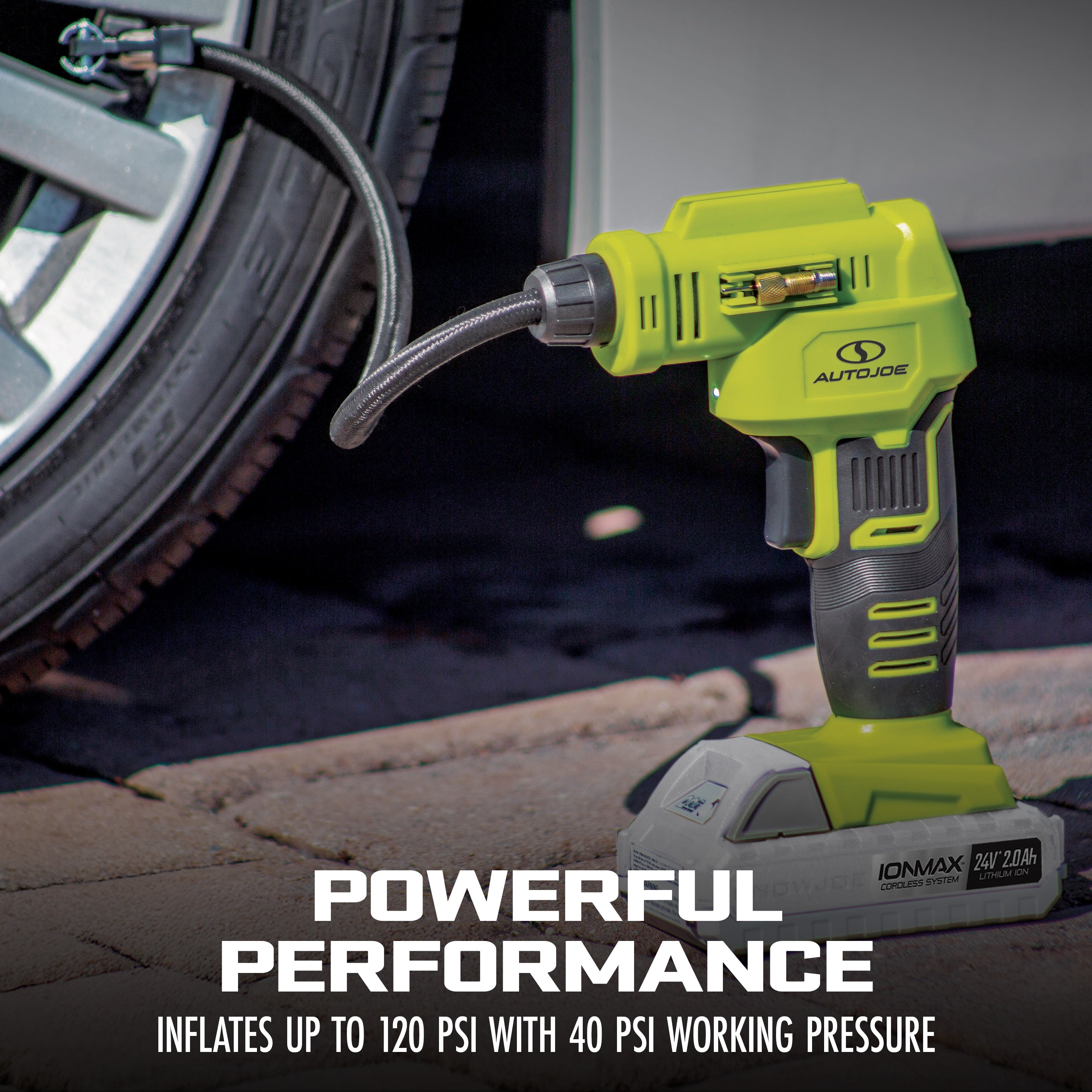 Inflate Anywhere, Anytime. Skip the gas station and keep your tires, sports balls, pool floats, and more at optimal pressure with the cordless 24V air compressor. Compact yet powerful, it features a digital display with auto shutoff, inflates up to 120 PSI, and comes with a 2.0-Ah rechargeable battery, charger, and accessories — all in a lightweight 3.1 lb. package.