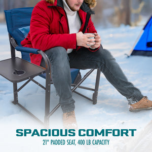 Experience unparalleled comfort and warmth with the Bliss Hammocks® by SUN JOE® 24V Heated Directors Seat, designed to elevate any outdoor adventure. This durable, yet stylish, chair available in 4 color way options (brown, blue, green, and gray) features a classic director-style frame with a generously padded 21-inch wide seat and backrest, supporting up to 400 lbs. Powered by Sun Joe's IONMAX 24V 2.0-Ah battery system, the chair boasts dual heat pads—strategically placed in the seat and backrest—offering three customizable temperature settings to keep you cozy in any weather. The collapsible powder-coated steel frame ensures easy transport and storage, while the foldaway side tray table with built-in cupholder keeps your drinks and snacks within reach. An auto power-save feature and 5-minute safety shut-off maximize battery efficiency, letting you enjoy warmth for longer. Perfect for camping, sporting events, or backyard gatherings, this lightweight 14.8-lb chair combines functionality with premium comfort, making it the ultimate outdoor companion. Comes with a 1-year warranty for added peace of mind. Find Your Bliss® and Go With Joe®.