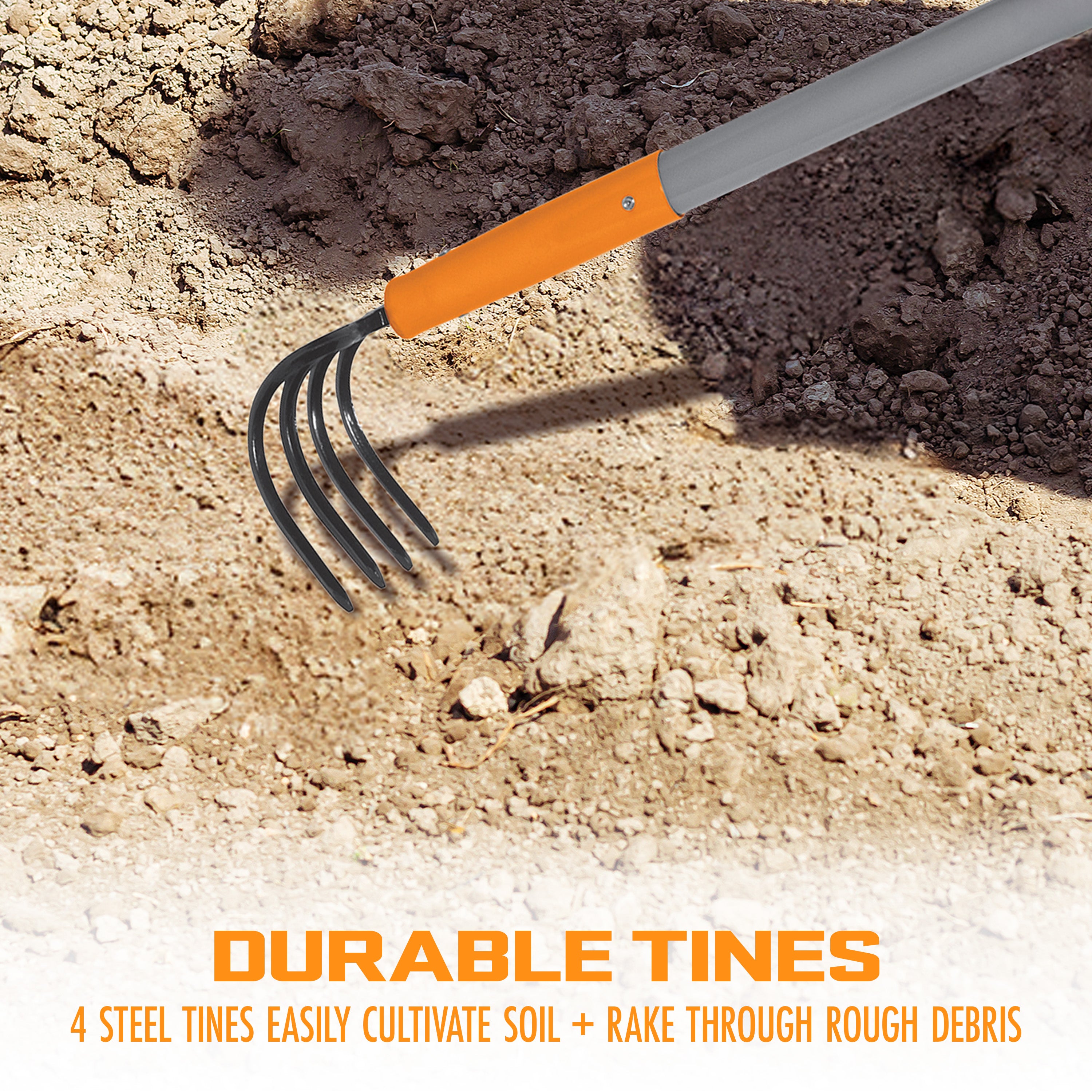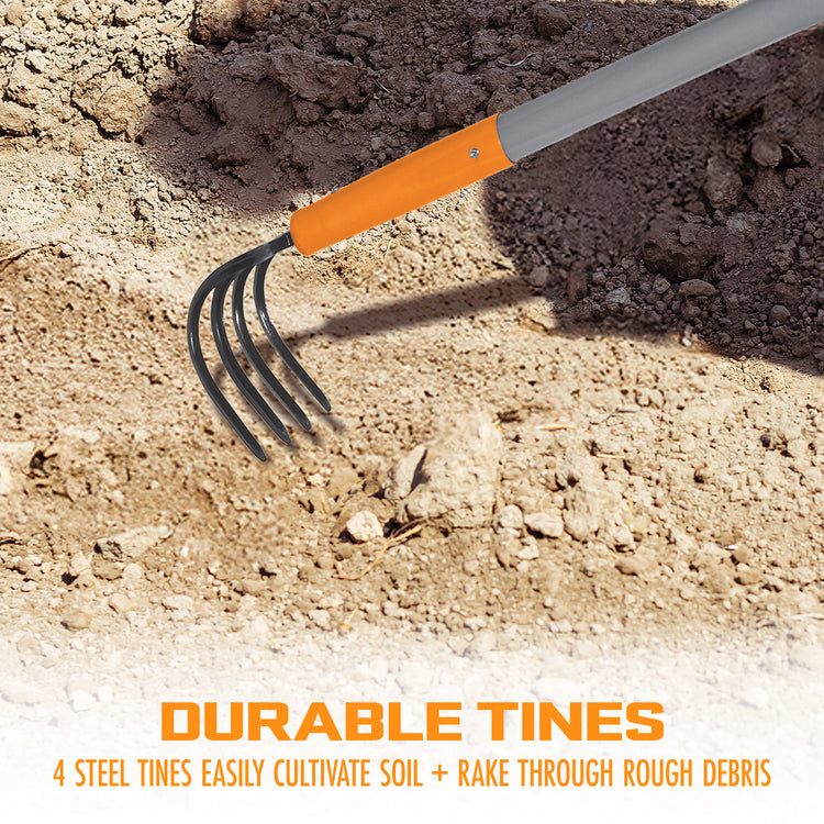 - DURABLE TINES: 4 steel tines easily cultivate soil and rake through rough debris