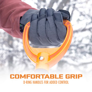 Hard-packed or deep snow takes muscle to move. Now you can cut the job down to size with the Ergie Shovel by Snow Joe. Featuring an ergonomic dual-handle design with durable D-grips for additional support and lifting leverage, Ergie Shovel lets you shovel smarter, not harder. Unlike traditional stick shovels that place tremendous strain on your lower back when you bend and scoop heavy loads of snow, Ergie Shovel changes the mechanics of shoveling to help reduce back strain. The wide 18" polypropylene blade with aluminum wear strip efficiently clears walkways and driveways right down to the ground without damaging your surfaces, while the 34.5" durable steel shaft ensures you can count on the Ergie Shovel season after season. This winter, Get Equipped with the Ergie Shovel from Snow Joe and leave back-breaking snow removal behind you.