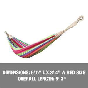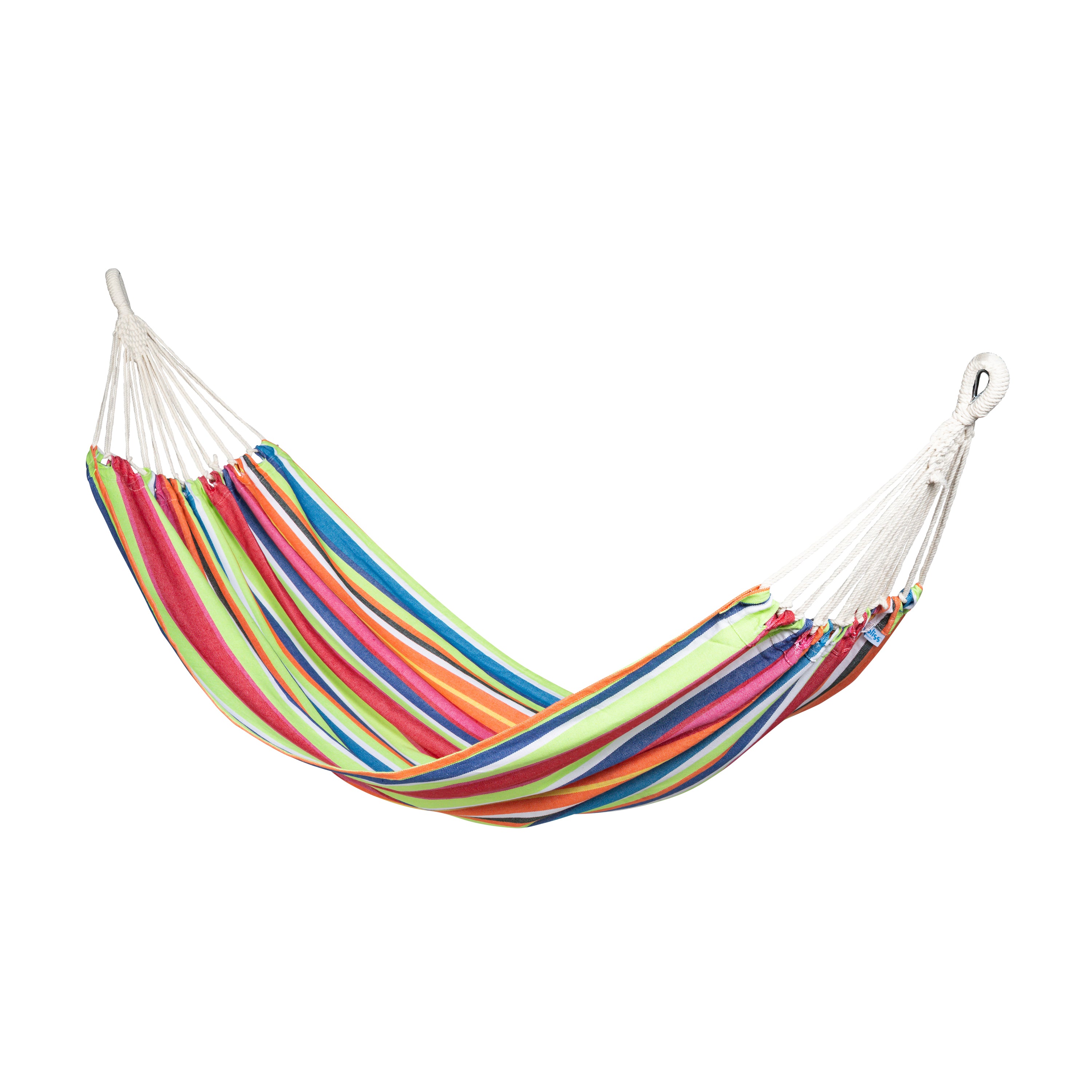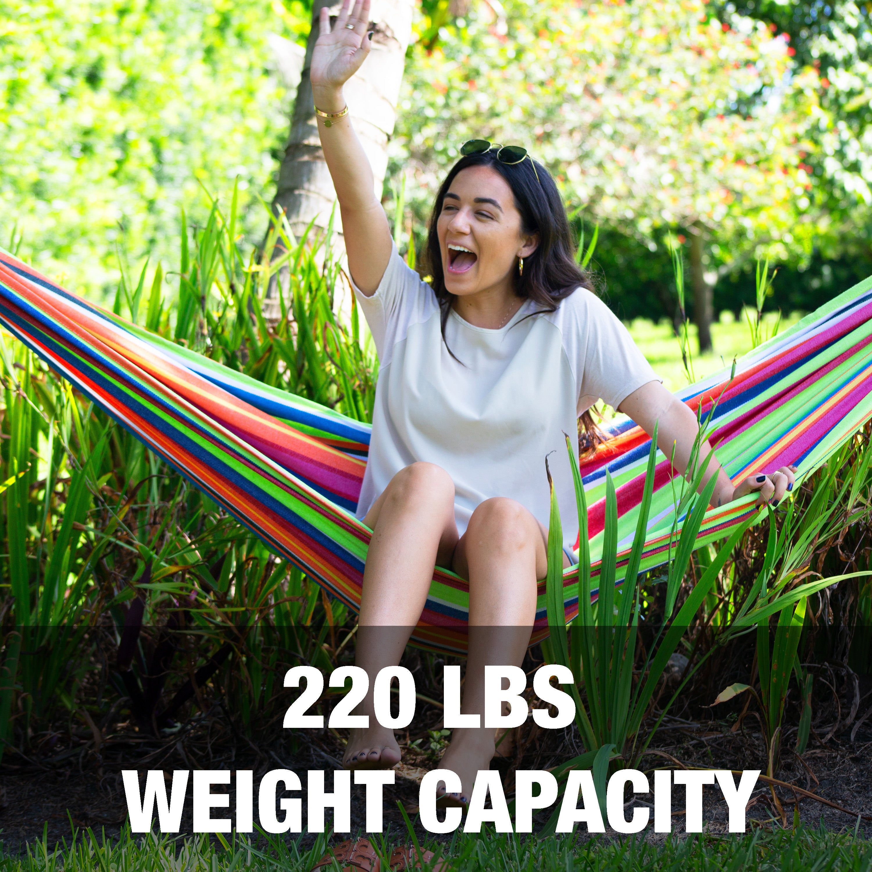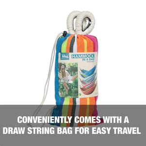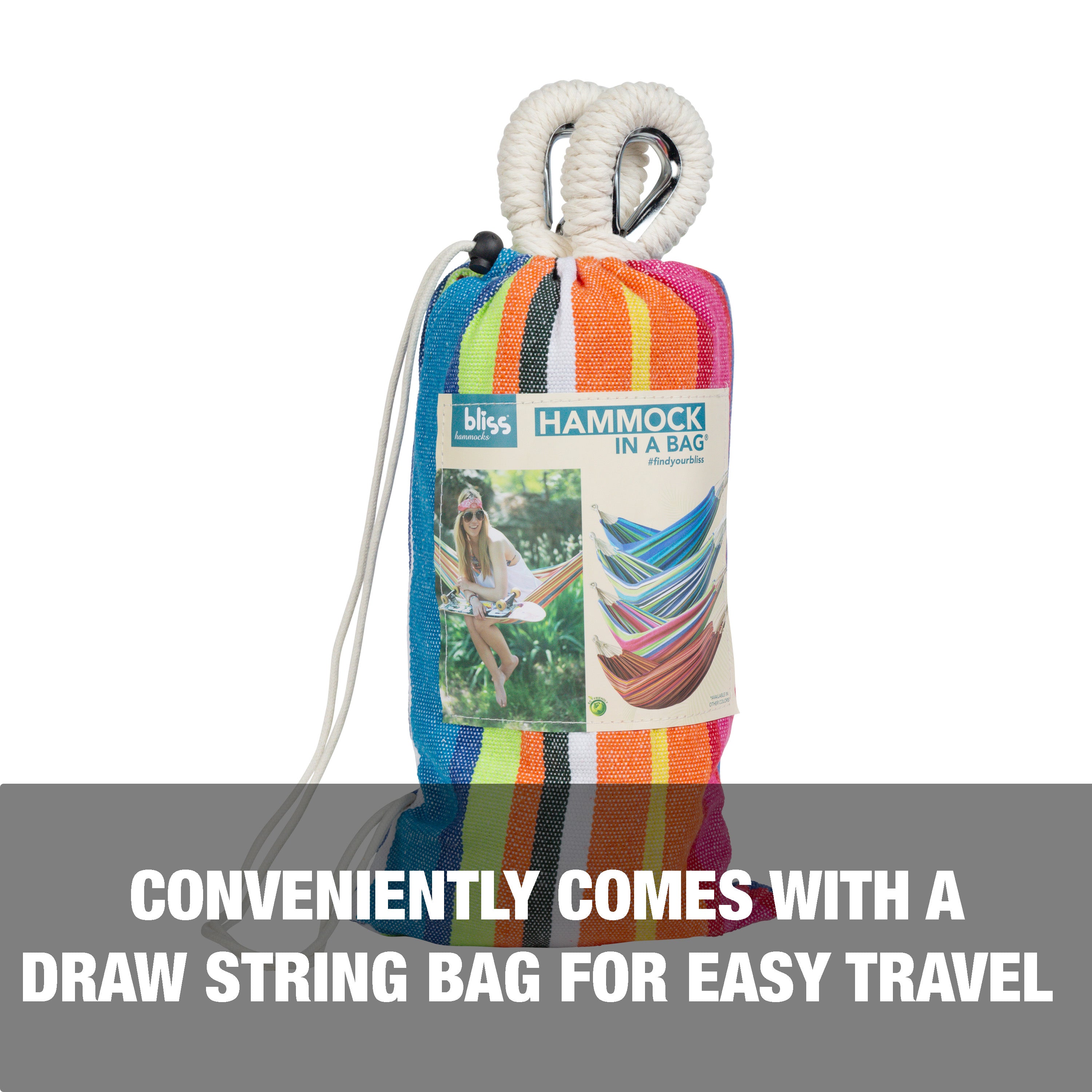- SLEEK AND STYLISH: Brazilian Style Hammock with a 40-inch-wide bed. Its compact design accompanied with an included draw string bag makes this the perfect travel hammock. Made of Eco-friendly recycled polyester and cotton fabric gives you the durability you need to last through the seasons ahead