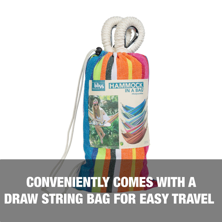 The Hammock in a Bag® is a versatile full size Brazilian style hammock. Made of a woven blend of breathable polyester and eco-friendly recycled cotton fabrics. It is the most comfortable gathered-end hammock, made to provide more comfort in commonly strained areas like the head, knees, and ankles. The loop ends are reinforced with steel and can be used both indoor and outdoor with great durability. All hanging hardware is included: (2) eye screws and (2) hooks making it easy to hang between trees or from an indoor ceiling and can be hung as a bed or a hammock chair. The overall weight capacity of this hammock is 220lbs. and comes with a one-year warranty...Find Your Bliss®