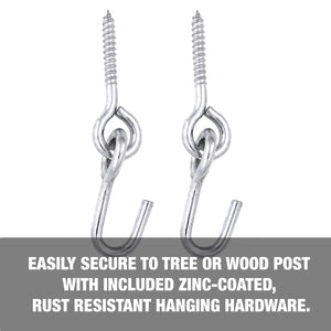 - EASY SETUP: Conveniently included, the zinc-coated rust resistant, hanging hardware (2) eye screw and (2) hooks make it easy to secure your hammock on a tree or wooden post