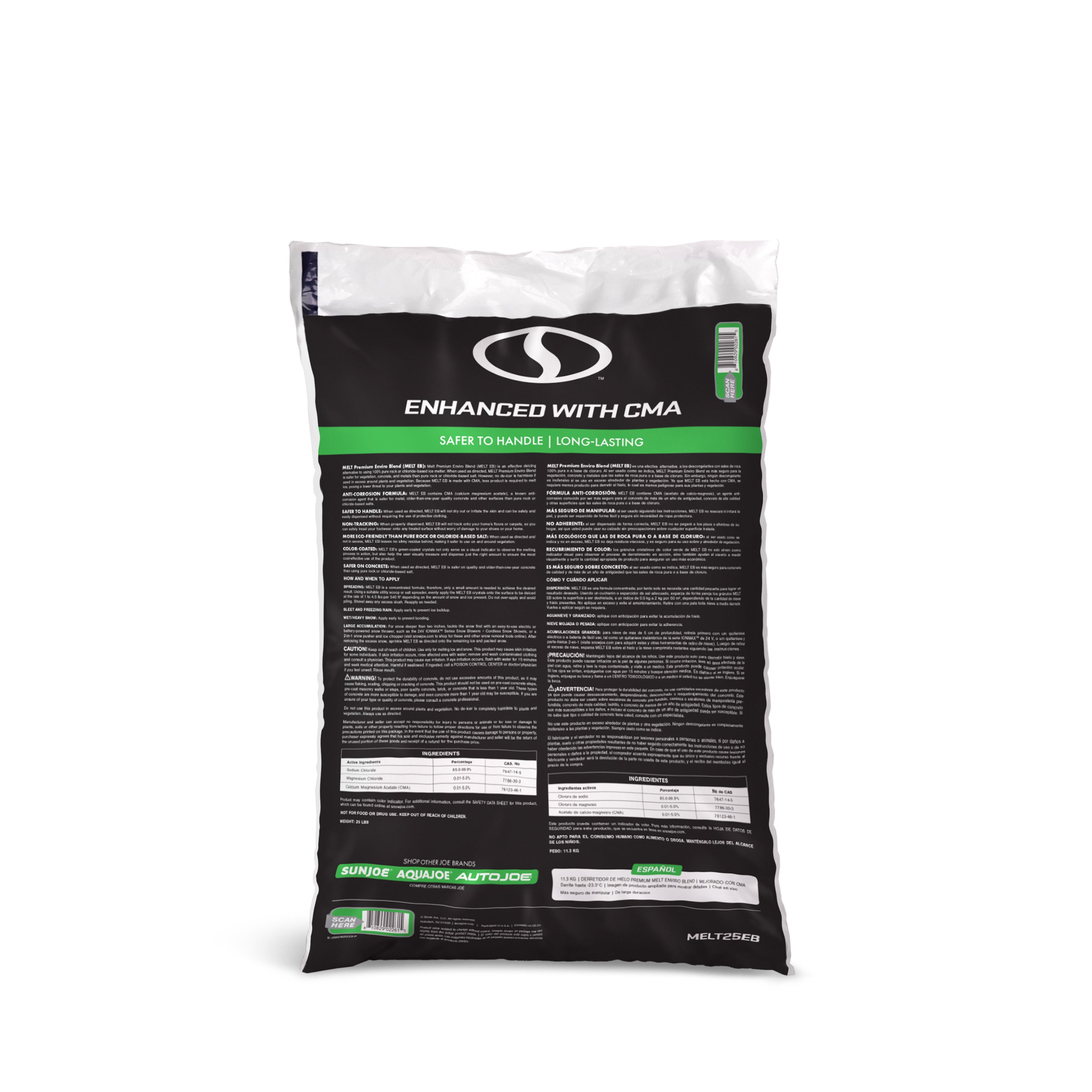 THE NICER DE-ICER: Thanks to its anti-corrosion formula that contains CMA (calcium magnesium acetate), Melt Premium Enviro Blend melts to -10°F and is safer for vegetation, concrete, and metals than pure rock or chloride-based salt. The formula works on surfaces longer, requiring less product, and won’t dry out or irritate skin, so no protective clothing is necessary. Plus, it doesn’t track onto your home’s floors or carpets or leave slimy residue behind, so you can safely tread your footwear on any treated surface without worrying about damaging your shoes or home. Finally, the green-coated crystals not only serve as a visual indicator to observe the melting process in action, but also help you visually measure and dispense just the right amount to ensure the most cost-effective use of the product.