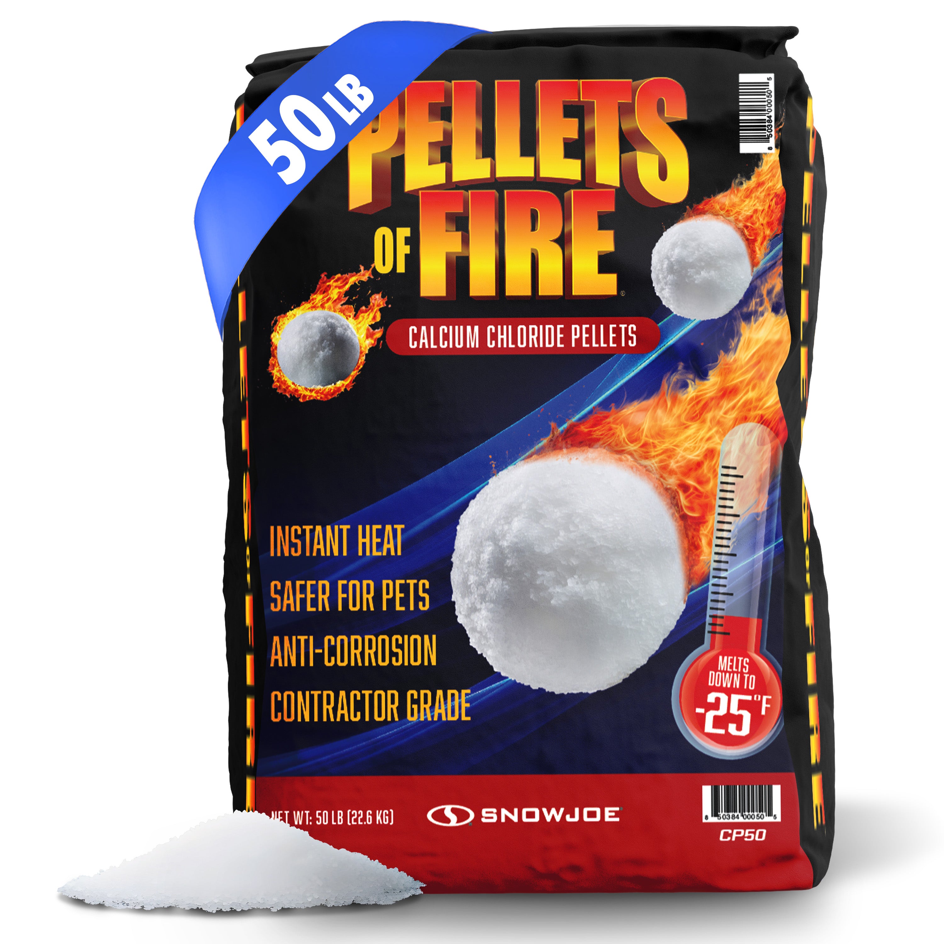 PROFESSIONAL STRENGTH. REMARKABLE RESULTS. Professional strength CP50 Pellets of Fire® Calcium Chloride Pellets is a unique formulation of calcium chloride pellets that accelerates the melting process by generating a large amount of heat on contact with snow and ice. It’s designed to quickly, safely, and effectively tackle frozen snow, sleet, and ice on most driveways, steps, sidewalks, and entryways. Proven safer when applied as directed to “quality concrete” surfaces, Pellets of Fire effectively melts ice and snow even at temperatures as low as -25°F, and can be conveniently dispensed directly out of the bag or into a handheld or wheeled salt spreader. It can also be used as a preventative — just apply at the first sign of snow to enable easy snow removal and prevent accumulation.