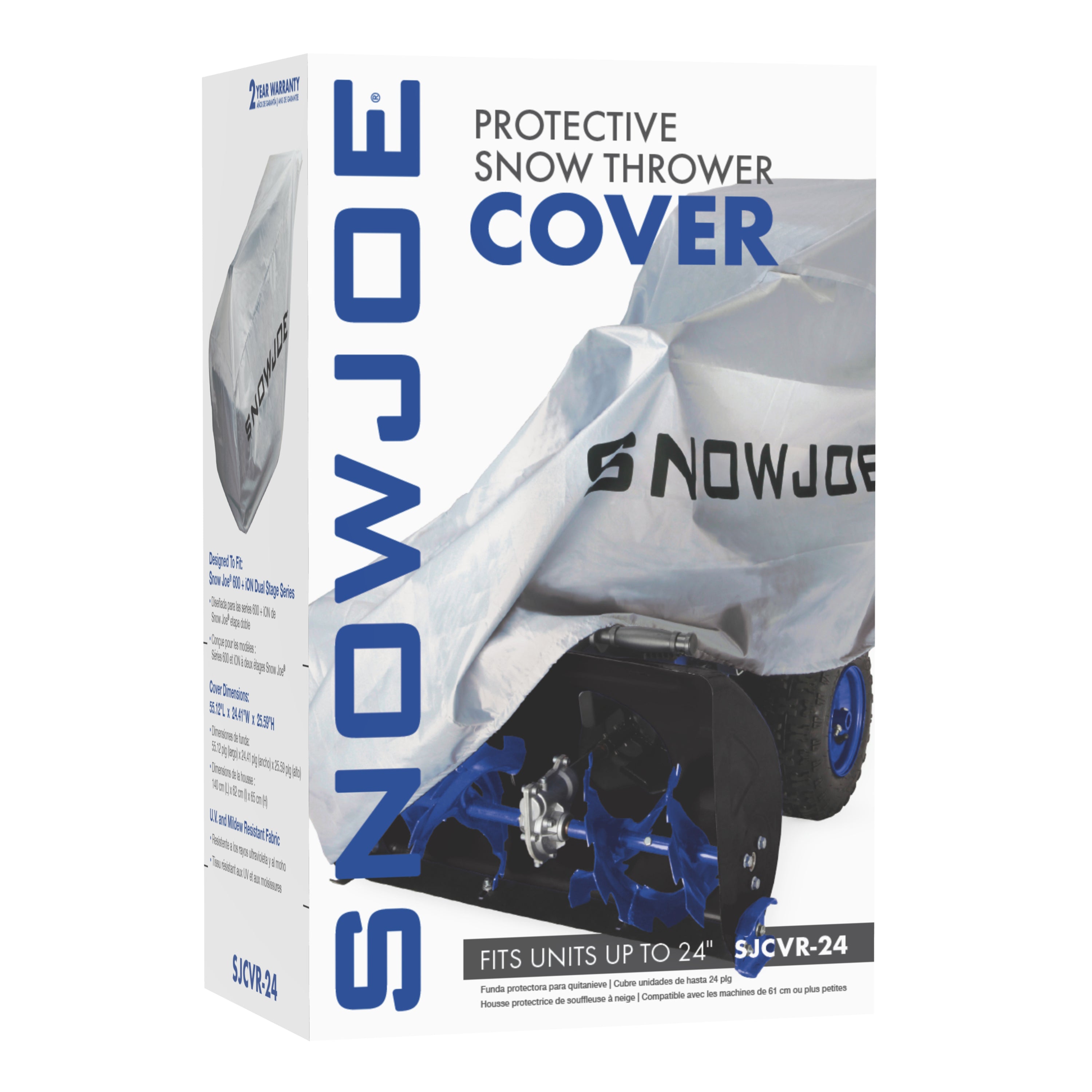 The SJCVR-24 cover from Snow Joe offers all-season protection for electric single stage snow blowers 24-IN in width. The cover is made of heavy duty fabric that won't shrink or stretch and is water resistant. The SJCVR-24 protects your electric snow blower investment against dirt, ice, snow, rain, sun damage, tree sap and bird droppings. You can cover your unit fully assembled for quick access during the season or fold the snow blower handles for long term storage. Putting on and taking off the cover is effortless in any weather condition. The SJCVR-24 is designed to perfectly fit your Dual-Stage iON24 Snow Blower and most other models 24 inches in clearing width.