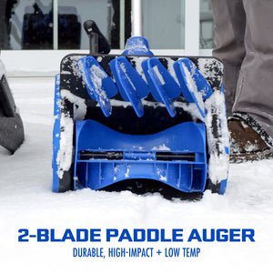 When winter blankets your neighborhood in snow, the Snow Joe 24V-SS13.5-XR cordless snow shovel is your efficient, modern solution for quick and easy snow clearing. Say goodbye to the hassle of cords and the fumes of gas-powered alternatives, and experience the cutting-edge convenience of Snow Joe's cordless snow clearing technology. With a powerful 900-watt motor, the 24V-SS13.5-XR cuts through snow with precision and power, clearing a 13.5-inch wide by 6-inch deep path in one pass. The high-impact, low-temperature paddle auger launches snow up to an impressive 21 feet, ensuring that your patios, decks, and sidewalks are clear and navigable in no time.