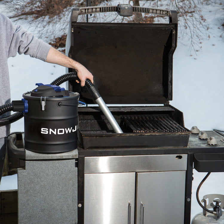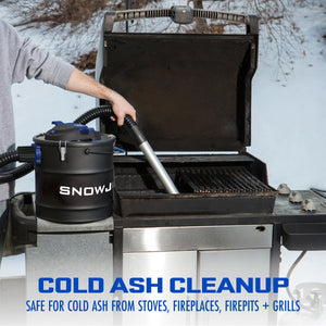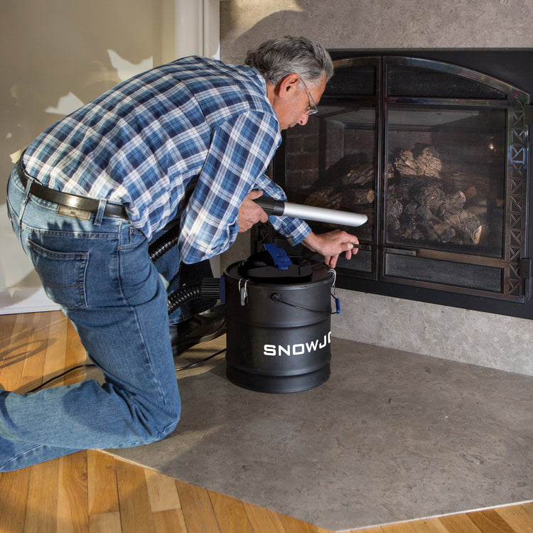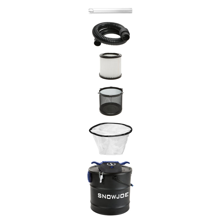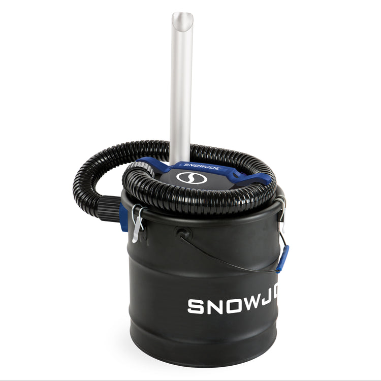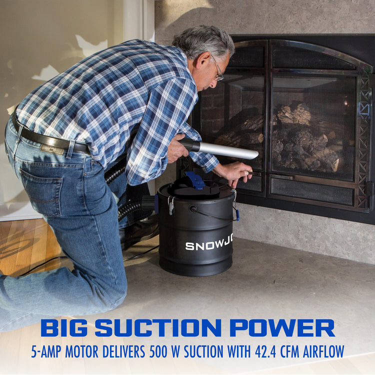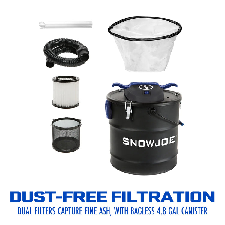 ASH IT OUT. The Snow Joe® ASHJ202E 5 amp 4.8-gallon Ash Vac is designed for cold ash pickup from wood stoves, pellet stoves, fireplaces, firepits, and BBQ grills. Equipped with a dual filtration system that employs both a coarse-dust pre-filter and a fine-dust pleated filter, the Ash Vac effectively traps dust particles during the ash cleaning process and prevents them from escaping into your breathing space. No more dusty mess around your home! Operation is simple: just insert the Ash Vac’s aluminum intake nozzle into your pile of cold ash, flip the switch, and watch its powerful 5-amp motor generate up to 500 W of suction power and 42.4 cubic feet per minute of air flow. The Ash Vac’s extra large metal canister stores up to 4.8 gallons of ashes, so you can finish your task without stopping to empty the container. Plus, it’s a self-contained, bag-free system, which allows for easy ash removal with a simple lift of the container lid. Other features include a safety stop switch to prevent the Ash Vac from operating without a properly fitted filter, a wire filter basket to protect the fine dust filter, an easy carry handle, an inspection window blockage indicator, and an onboard cord/hose organizer for convenient storage. Backed by a full 2-year warranty, the Ash Vac ASHJ202E is the reliable cleanup tool you’ll need to deal with any ash problem in a simple, clean and safe way.