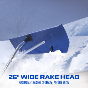 SNOW JOE TO THE RESCUE. Prevent damage due to the heavy snow loads piled onto your roof and save on costly repairs with the Snow Shovel Roof Rake from SNOW JOE. Handy, easy-to-use and affordable, this durable roof rake quickly removes snow and other debris from your roof while you stand safely on solid ground. The heavy-duty aluminum rake head quickly and easily removes snow from hard-to-reach heights. Simply roll the roof rake frame on the smooth-glide rollers wheels and the 26" x 7" oversized rake head clears away heavy, packed snow. The four included extension poles provide five different length options — 26' | 22' | 18.1' | 14.2' | 10.3' — to suit the tallest or shortest roof. And weighing just 5 lbs, this ultra-lightweight, durable winter essential is easy to maneuver. So, when your roof is feeling the weight of winter: Go With Joe®. RJ207M Snow Shovel Roof Rake from SNOW JOE®. GET EQUIPPED®.