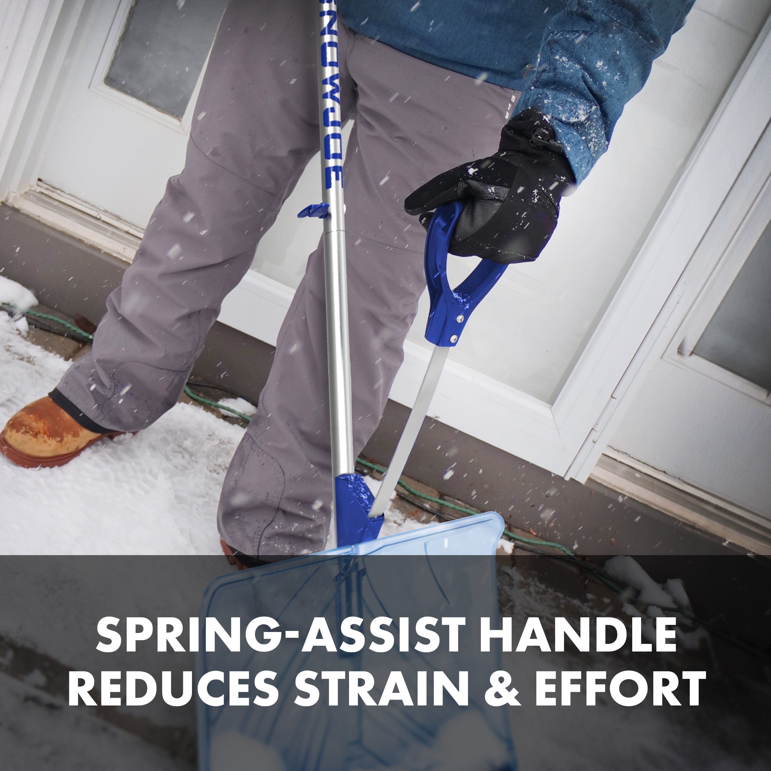 - Spring-assist handle acts as a fulcrum – changes mechanics of shoveling, reduces strain