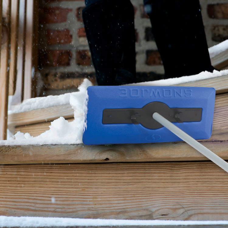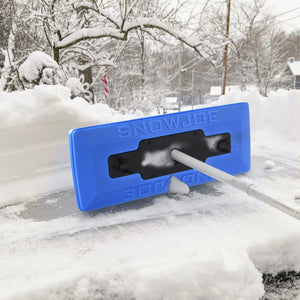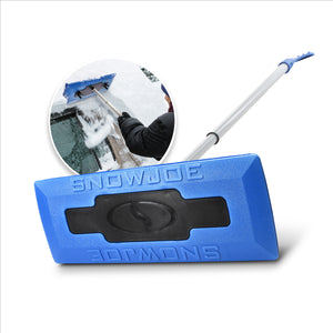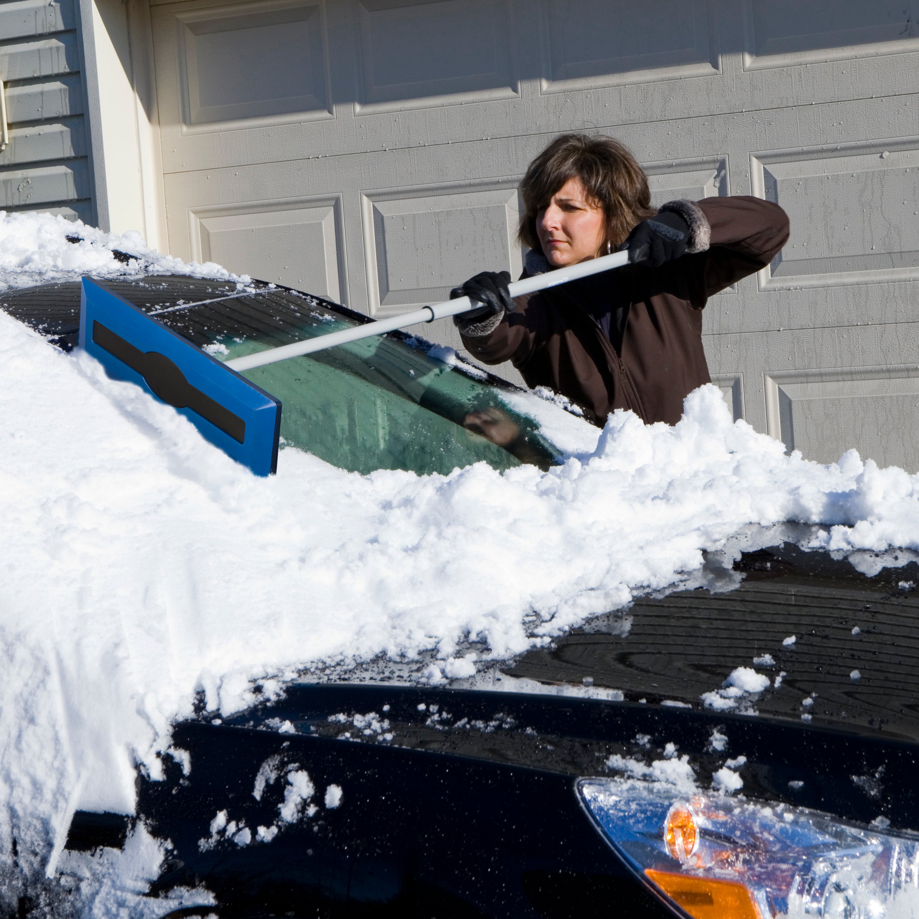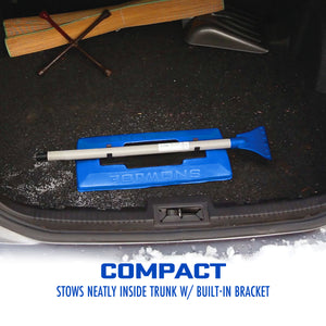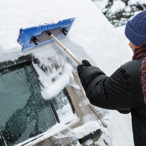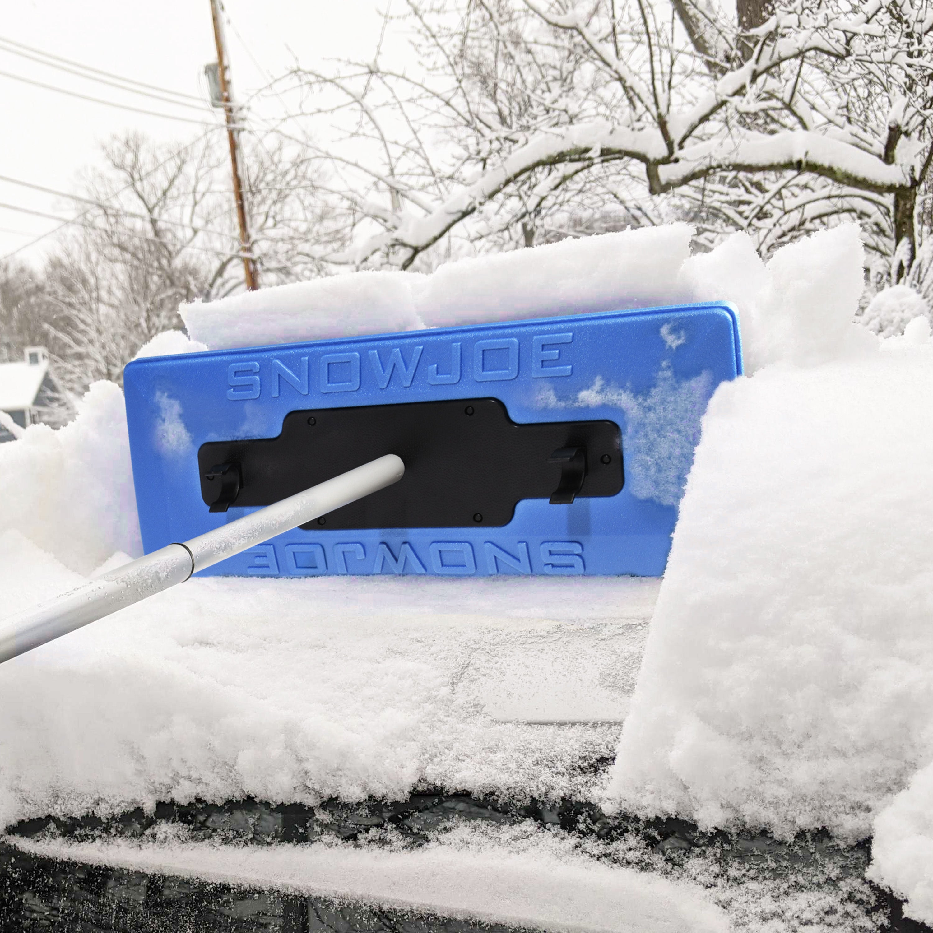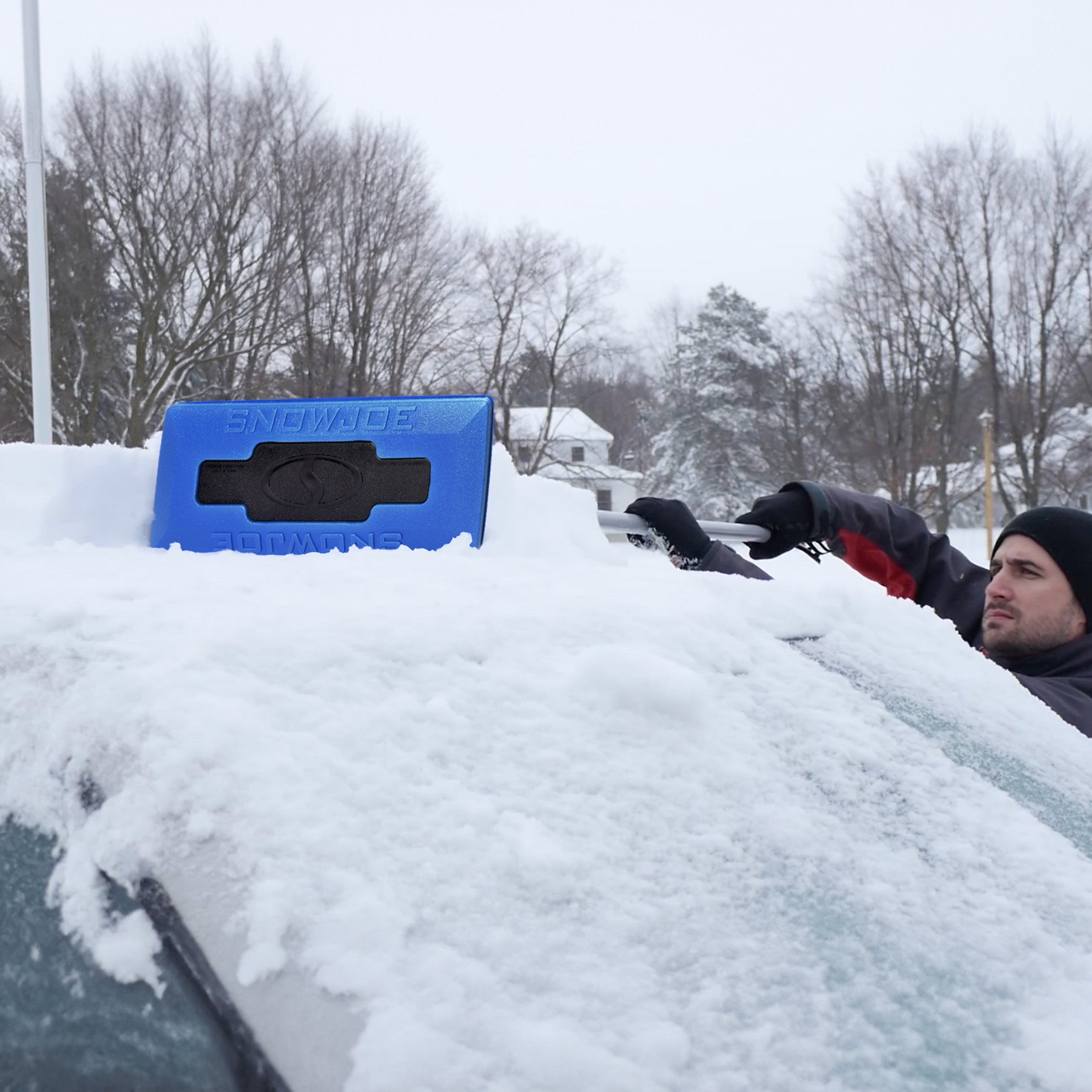 SNOW PROBLEM! The Snow Joe® Snow Broom model SJBLZD makes quick work out of the snow piled on the roof, hood, trunk or windshield of your car. Its patented dual-purpose design features a broom head on one end and a built-in ice scraper on the other, so you can quickly push heavy, wet snow off your car, then clear away the ice build-up on your windshield with just one tool. Made with a durable, reinforced, non-abrasive foam head, the Snow Broom safely and effectively sweeps snow off your car without scratching the glass surfaces. Plus, its telescoping pole extends from 33 to 52 inches to provide maximum reach with minimal strain. The Snow Broom is super easy to handle and stores neatly inside the trunk of your car with its built-in bracket holder. GET EQUIPPED® this winter with the Snow Joe® Snow Broom and clear out fast from tough winter messes.