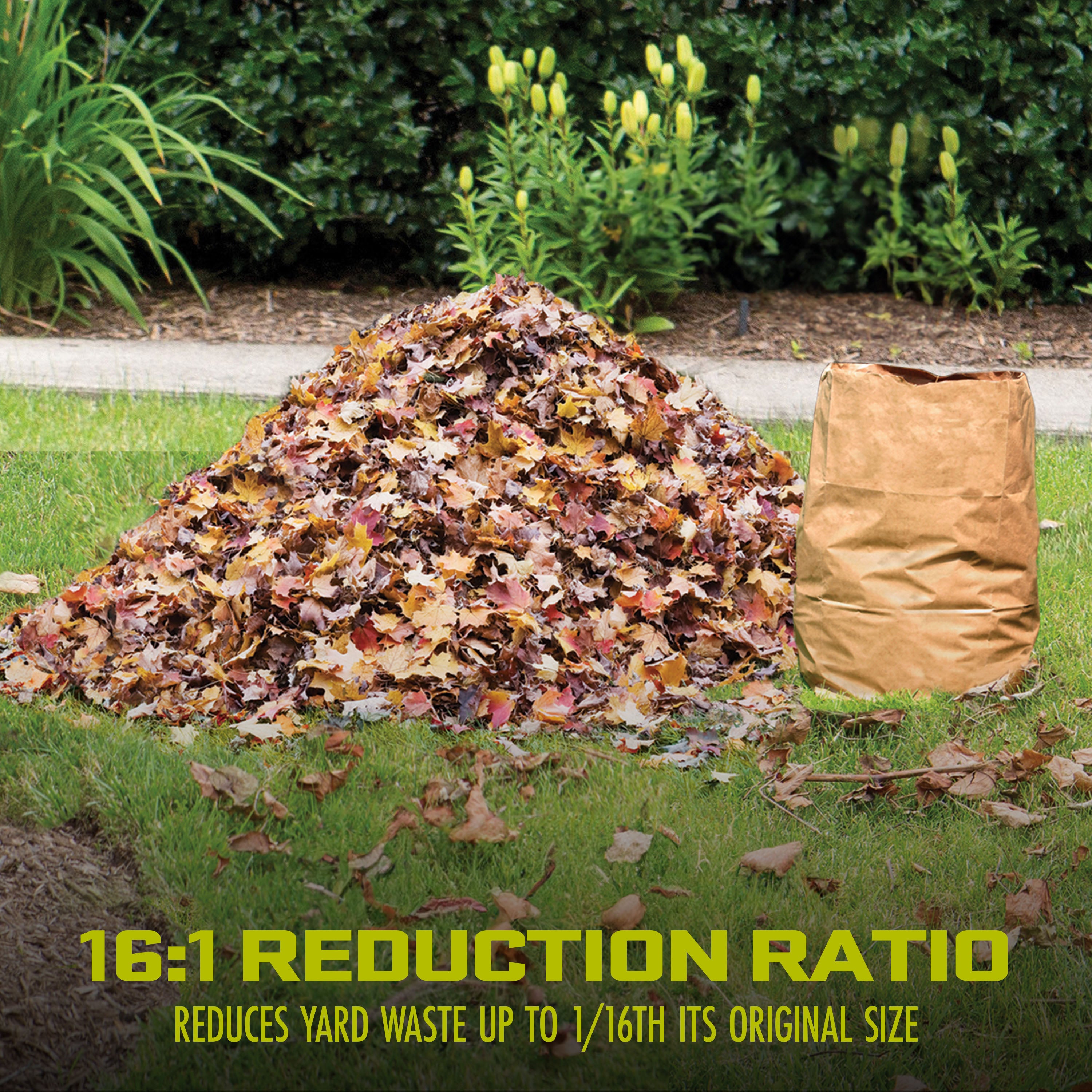 - Powerful 13-amp motor with 8,000 rpm mulches up to 55 gallons (208 l) of leaves per minute and reduces yard waste up to 1/16th its original size