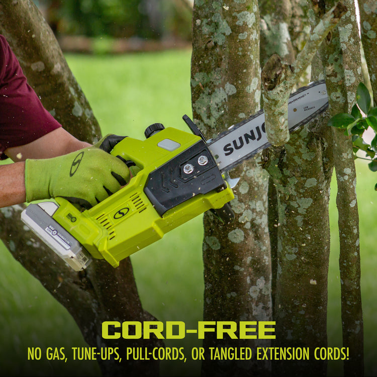 CUT THE CORD® ON A CORD OF WOOD. The next generation in tree-trimming tech meets the legendary iONMAX series in the 24V* MAX 10-Inch Cordless Chain Saw from SUN JOE.