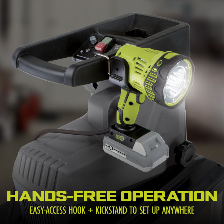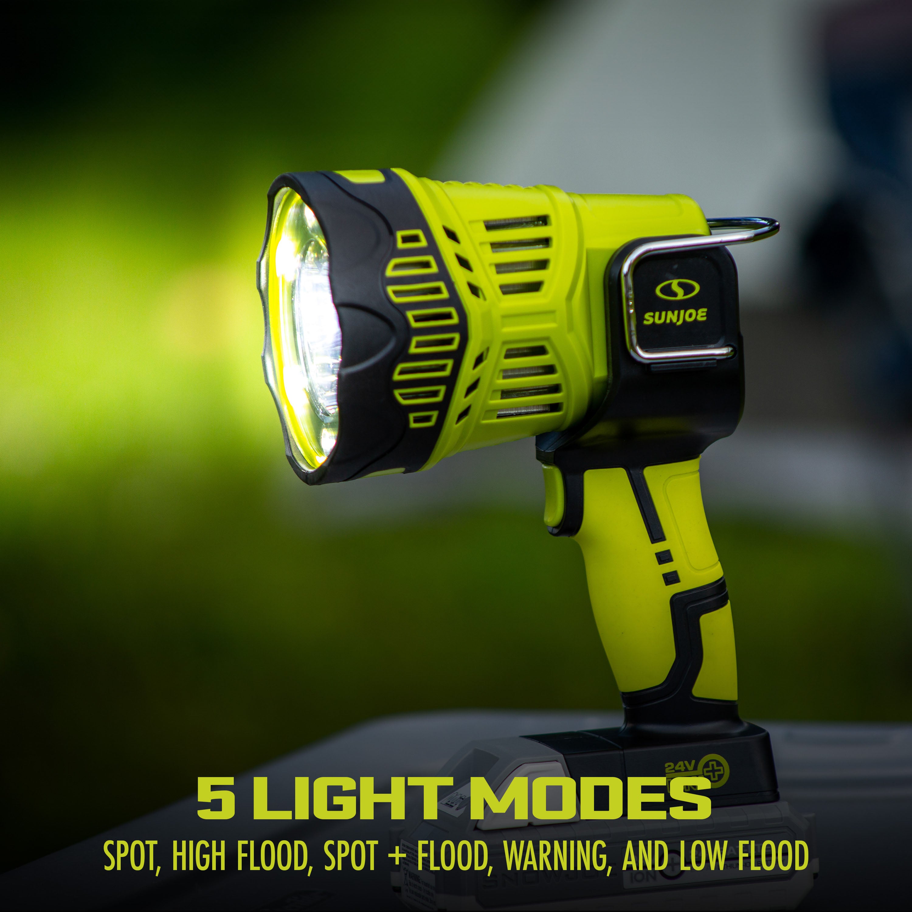 LET THERE BE LIGHT! If you're stuck without power, trying to work in a dark, dreary basement or at the worksite or campsite at night – it's time to turn on the 24V* Cordless LED Handheld Spotlight from Sun Joe. Powered by the 24-Volt* IONMAX system, the included 2.0 Ah battery provides rechargeable runtime — perfect for power outage situations! The selectable light modes provide 5 different settings to suit the task: Spotlight, for illuminating tight spaces | High Floodlight, for brightening up a darkened room | Spot + Floodlight, to light up the darkest spaces | Warning, to signal for help | Low Floodlight, for a soft glow. With up to 1500 lumens max of power, Sun Joe casts light up to 700 yards away for max visibility when you need it most. Need a light straight ahead, at an angle, or straight up? Sun Joe's got you covered! The adjustable multi-angle head shines right where you want it, and only where you need it. And the onboard easy-access hook + kickstand makes it easy to go hands-free and set up anywhere you need a little light. So, when you're in the dark, Go With Joe®! The 24-Volt* Cordless LED Handheld Spotlight from Sun Joe®. GET EQUIPPED®.