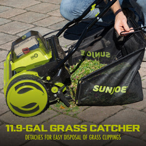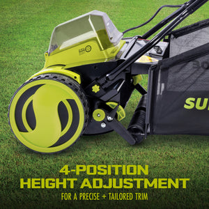 Sun Joe's 360 Watt motor is engineered for efficiency, providing you with maximum motor performance + cutting precision. The innovative 5-blade RAZOREEL rotor lifts and cuts each individual blade as you walk, clearing at 15-inch path in a single pass. Customize your cutting height with Sun Joe's 4-position manual height-adjustment lever — choose from 0.6", 1.0", 1.5", and 2.0" for the perfect, precise trim tailored to your yard. Plus, Sun Joe’s included 11.9 gallon grass-collection bag makes disposing of lawn clippings quick and easy. And when the work is done, simply plug the IONMAX battery back into the included Quick Charger and you're ready for the next mowing day.