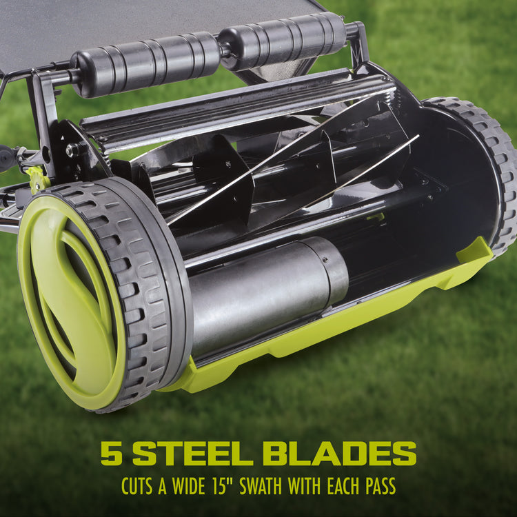 Features Cordless Push Reel Mower, 15 Inch Sharpened Steel Blades, 4 Height Positions