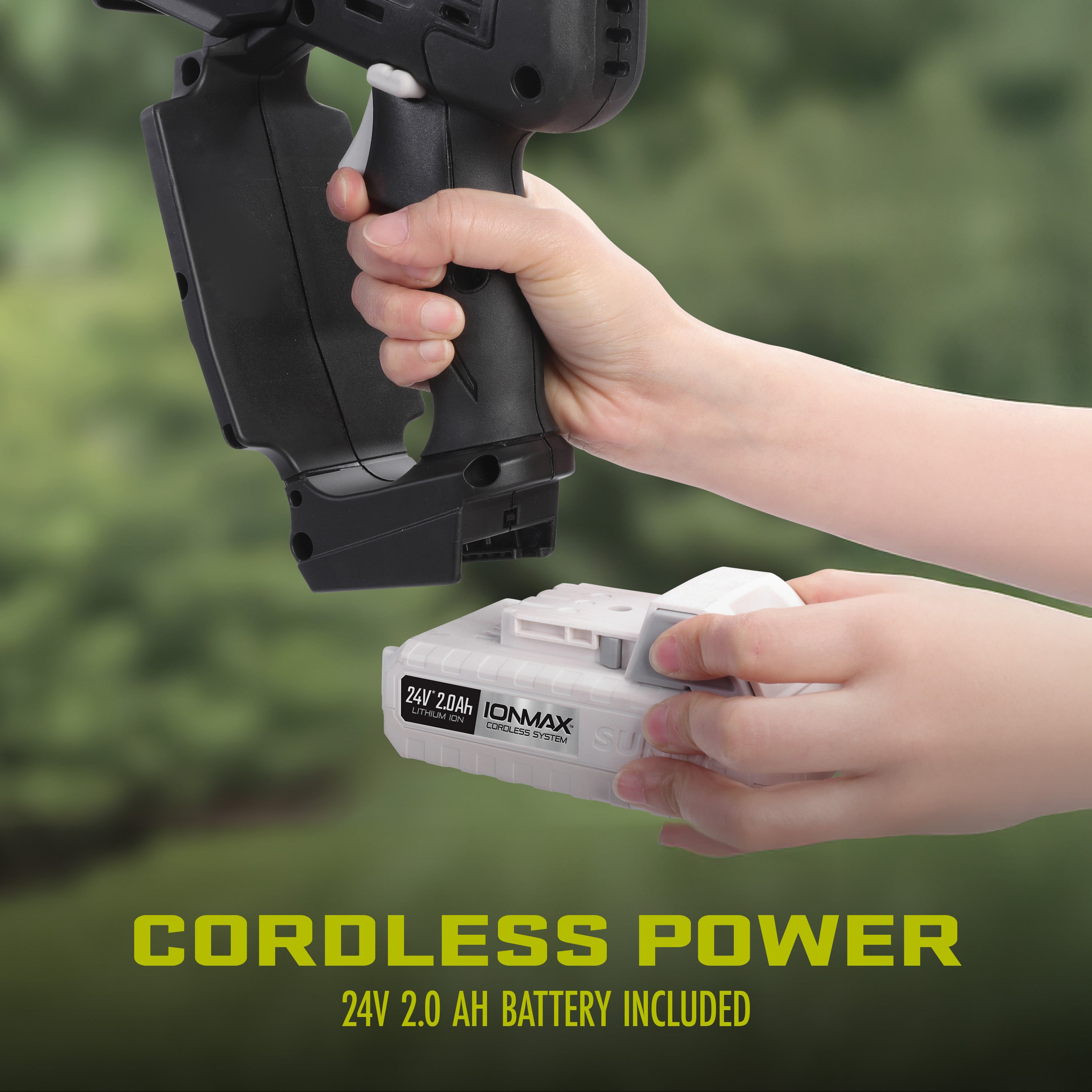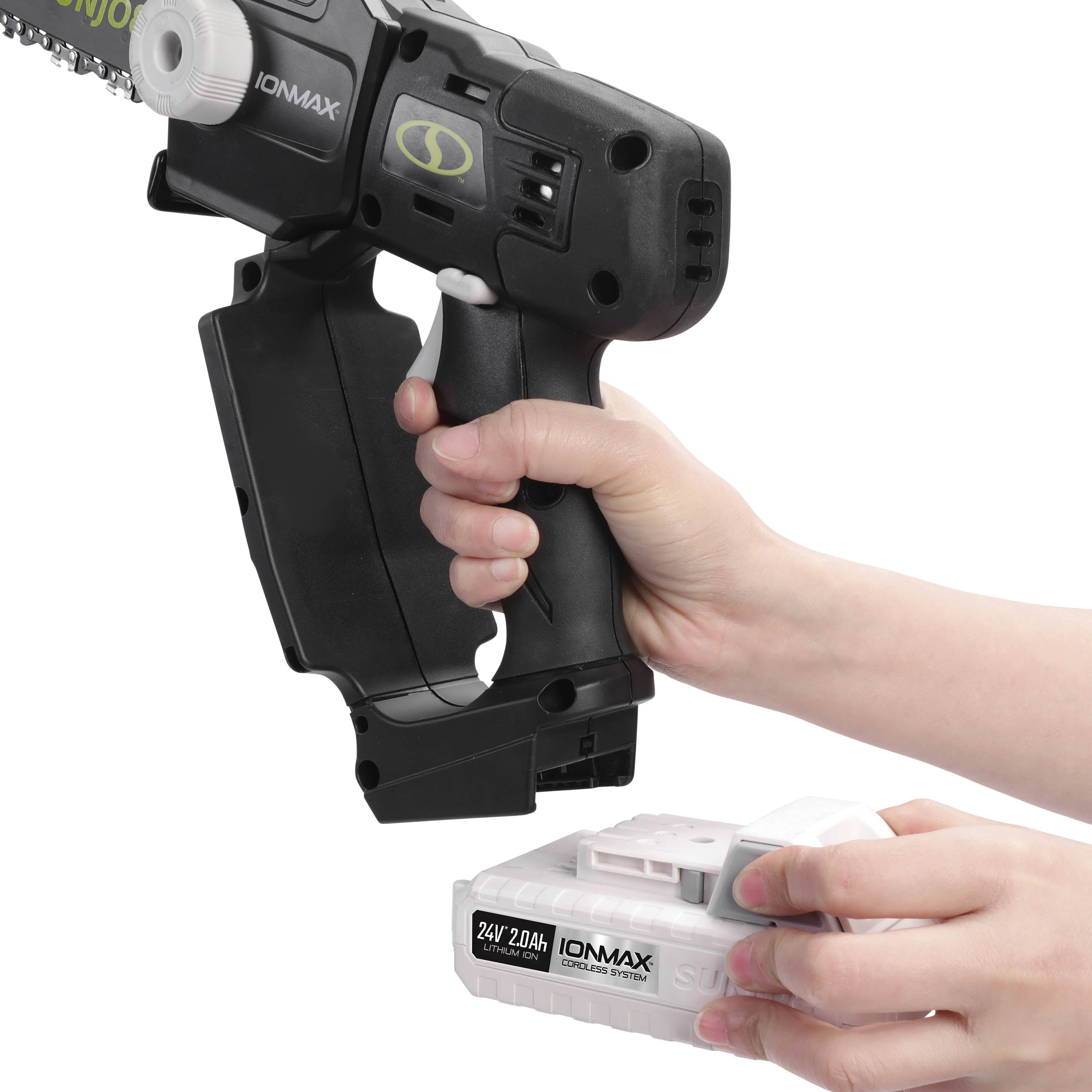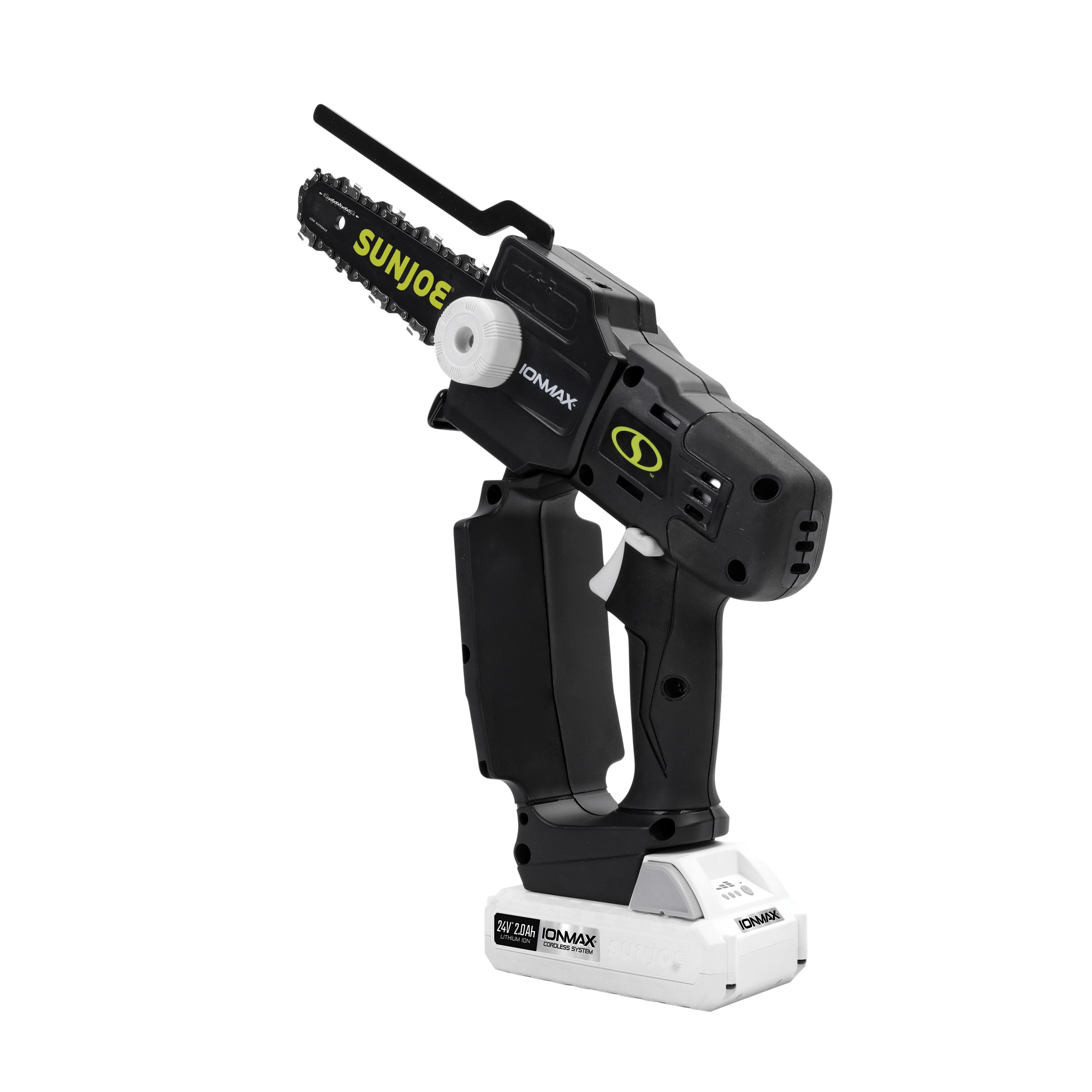 New for this season, Sun Joe cuts a max thickness of 5.5 inches, the largest of any hand held chainsaw we have offered, with 9 multi-angle head positions, and features an IONMAX 24-volt* lithium-ion battery, charger, removable battery compartment, wrench, and bar and chain oil. 2-year warranty.