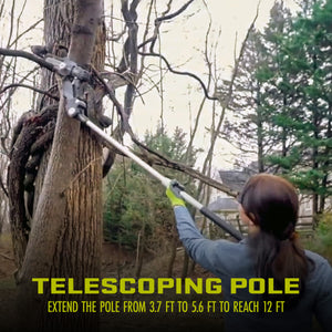 - TELESCOPING POLE: Stand safely on solid ground and simply adjust the pole from 3.7 ft to 5.6 ft for an overhead reach of up to 12 ft.