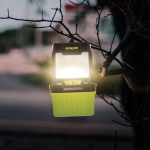 GO HANDS-FREE! Thanks to a handle for portability and a hanging hook for hands-free illumination, the Sun Joe® 24V IONMAX Cordless Lantern is ideal for use around the house, in the car, on camping trips, in case of emergencies and more! Powered by a 24V 2.0 Ah IONMAX battery, SUN JOE generates up to 500 lumens and features a USB-A and USB-C 2 port for charging small appliances + devices. Plus, it can charge for up to 4 hours with the light off for a max runtime of 18 hours, and boasts a water-resistant design for use on walks, runs, and hikes in a drizzle. 4 handy light modes include: Daylight, Warm White, Combined, and Warning Light, for emergencies.