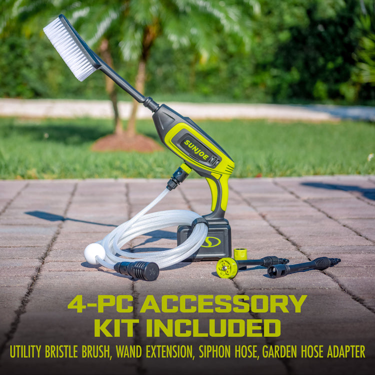 - 4-piece accessory kit includes: utility bristle brush to scrub away dirt and clean wheel wells, 11.9-inch extension wand, 20-ft siphon hose, garden hose adapter to connect directly to the spigot