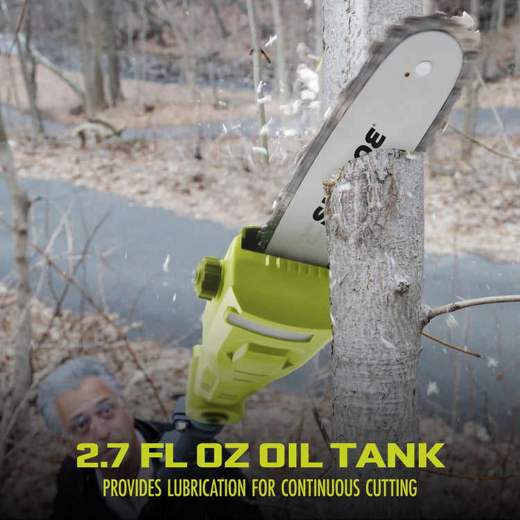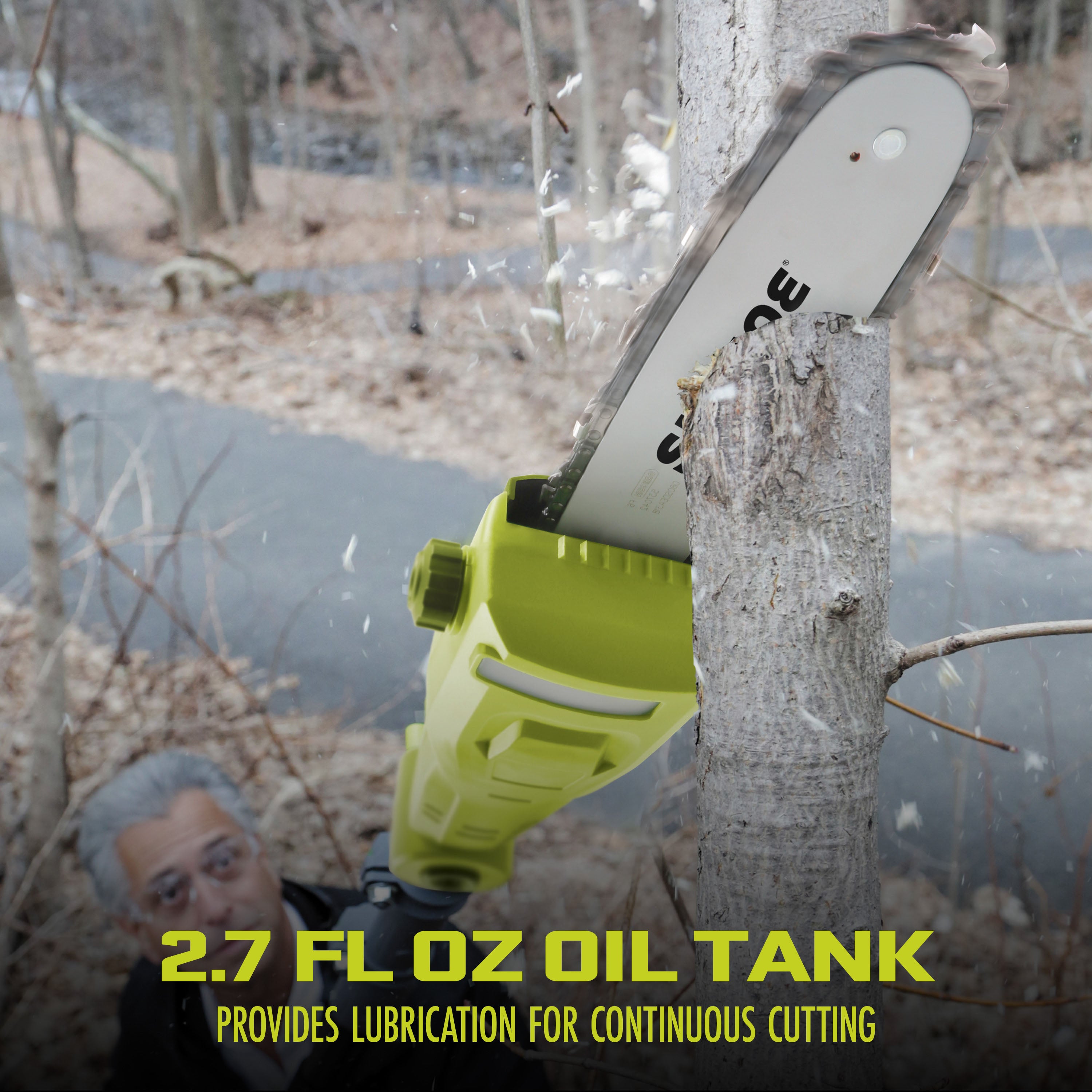 Powered by a robust 350 W motor and revolutionary lithium-ion battery power, 24V-PS8-CT’s multi-angle head can quickly adjust from 0º to 30º for maximum cutting control. And SUN JOE’s auto-lubricated 8-inch bar and chain can handle the most stubborn brush, branches, limbs and logs up to 7.5-inches thick.