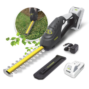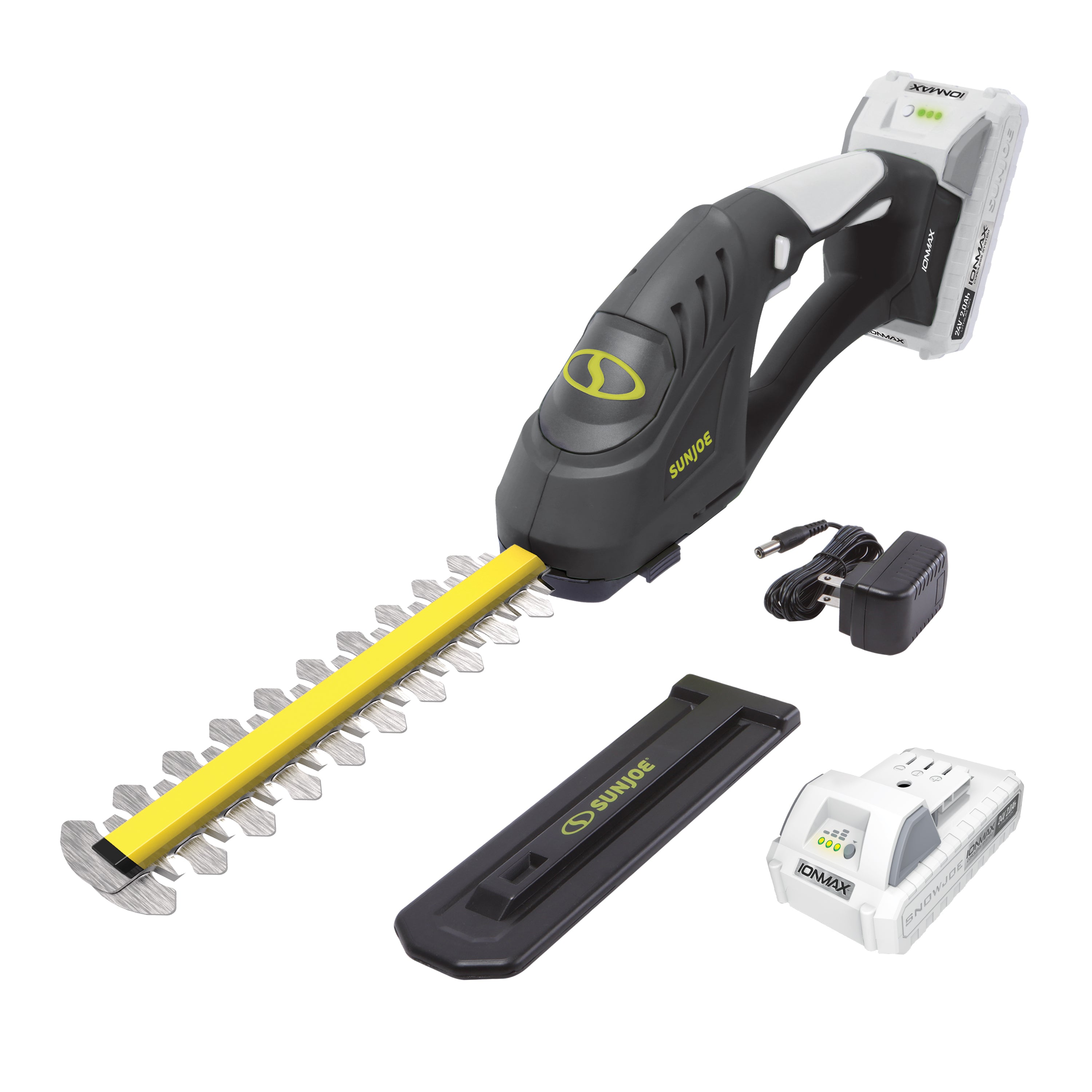 POWER MEETS PRECISION. Shape up your shrubs in those hard to reach places with the 24-Volt* IONMAX Cordless Handheld Hedge Trimmer. Perfect for detailed trimming, potted plants and topiaries, 24V-SSEG-LTE makes trimming touch-ups hassle-free thanks to the 24V* cordless operation. The included 2.0 Ah lithium-ion battery is ideal anywhere power is at a premium. Just insert the IONMAX universal battery, power up, and get your shrubs back in shape! And SUN JOE is cord-free and maintenance-free, so you can get your to-do list done without having to worry about gas, oil, costly seasonal tune-ups, or toxic emissions. The 7-inch steel blades easily slice through twigs, leaves, brush and branches up to 0.3” in diameter, for a crisp, clean and precise cut every time. Lightweight at just 3 lbs, SUN JOE provides all the power of a heavy-duty hedge trimmer with the precision of a handheld trimmer. So, when the bushes are overgrown, CUT THE CORD® and Go With Joe®. The 24V-SSEG-LTE 24-Volt* Cordless Handheld Hedge Trimmer from SUN JOE®. GET EQUIPPED®.