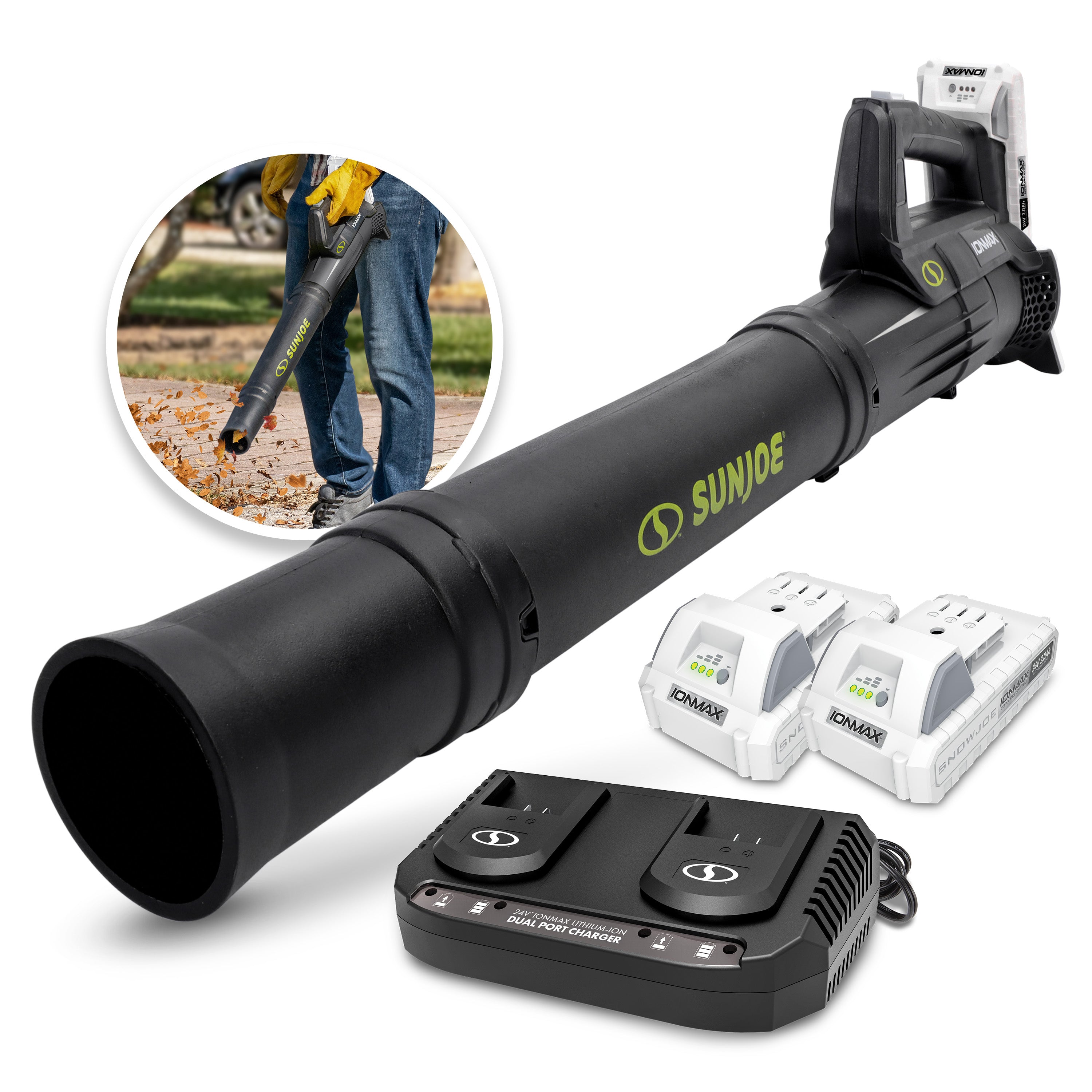 - IONMAX 24-VOLT* SYSTEM: Kit includes (1) SUN JOE cordless turbine jet blower, (2) 24V 2.0Ah IONMAX batteries, and (1) 24V IONMAX dual-port charger