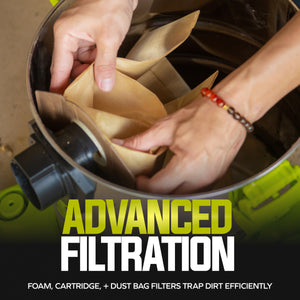 - MULTI-STAGE FILTRATION: Foam filter, cartridge filter, and paper dust bag for efficient dirt and dust capture