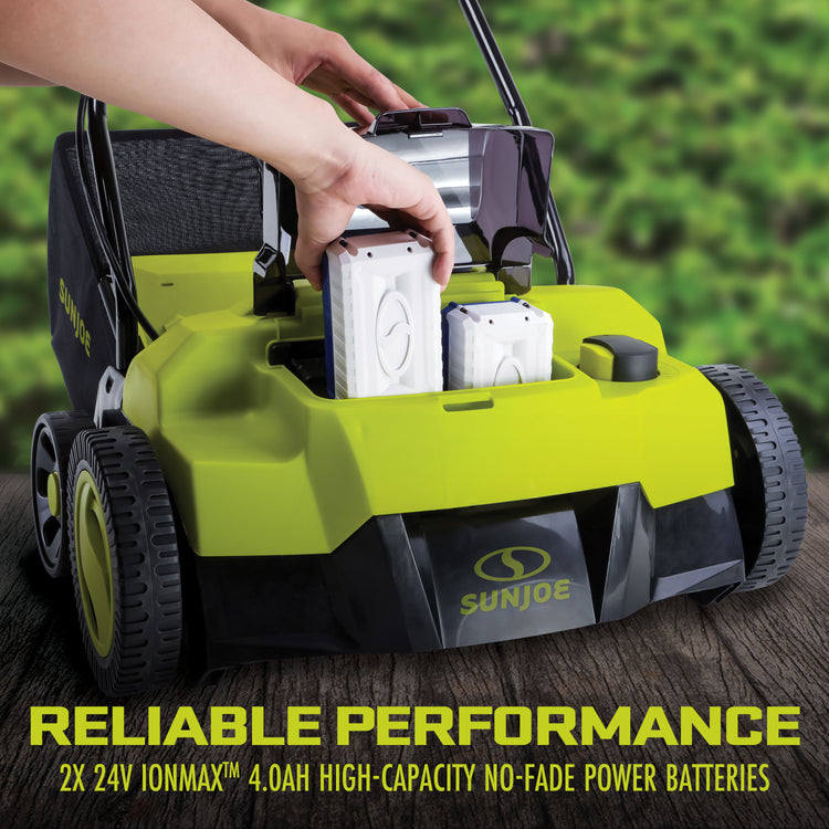 Sun Joe 24V-X2-DTS15 48-Volt* IONMAX Cordless Scarifier + Dethatcher | 5-Depth Positions | 15-inch | Brushless Motor | W/ 2 x 4.0-Ah Batteries + Charger