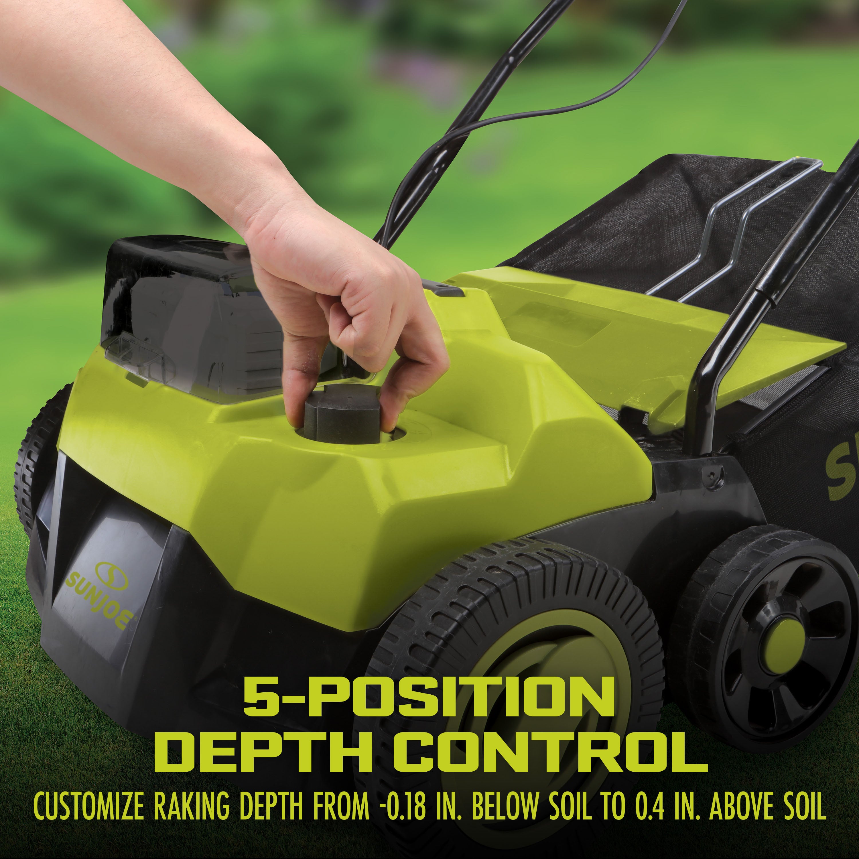 The 5-position depth control knob tailors the raking depth — from -0.18 in. (4.5 mm below the soil) to 0.4 in. (10 mm above the soil) — and the scarifying depth — -0.375 in. to 0.2 in. — to suit your lawn. And Sun Joe's included 10.6 gallon collection bag keeps your yard clear of debris.