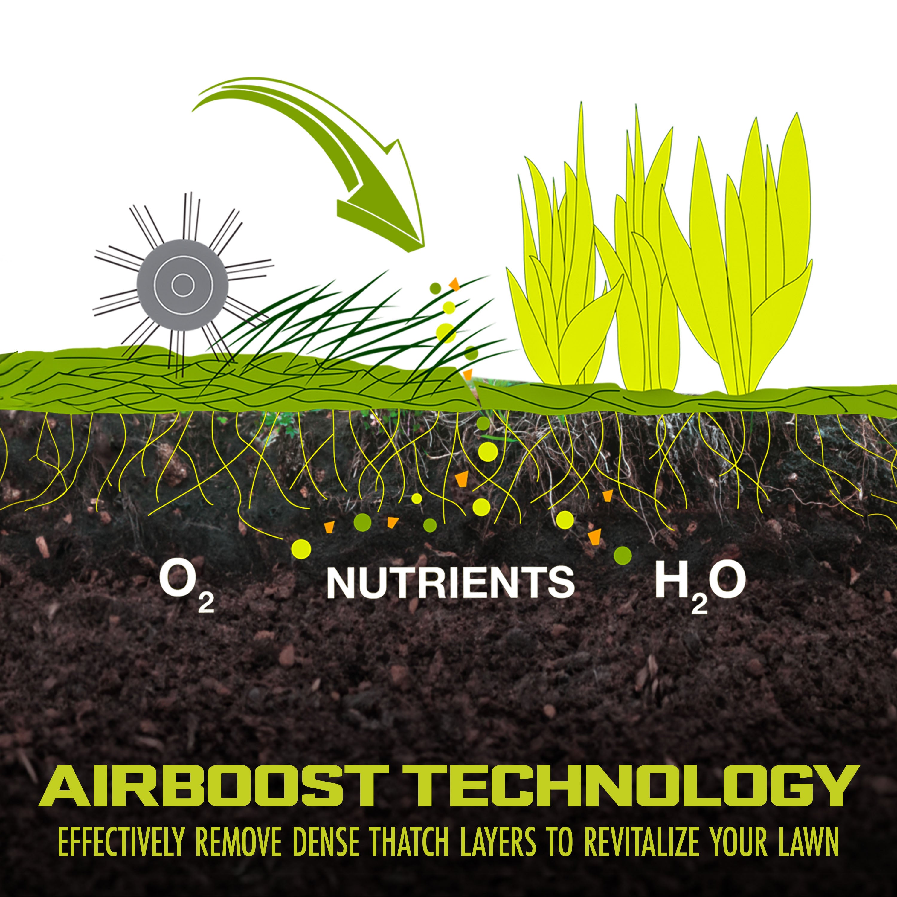 - AIRBOOST TECHNOLOGY: Spring steel tines stay sharp longer for maximum thatch pickup