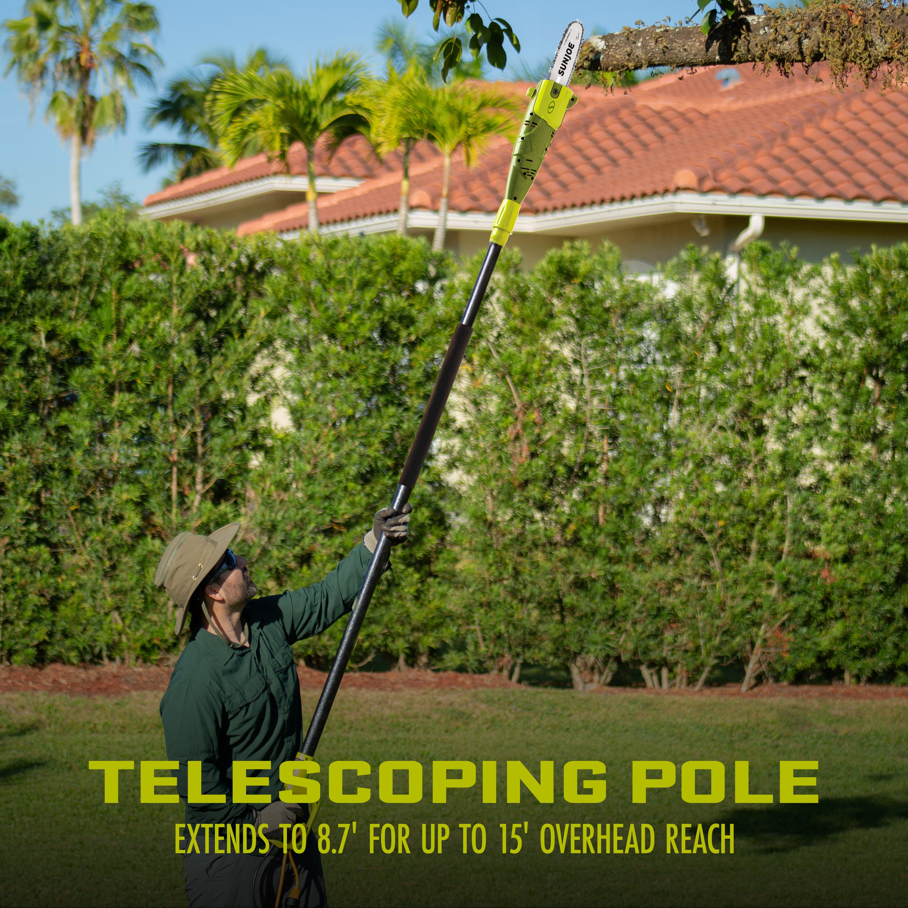 LET GRAVITY DO THE WORK®! The Sun Joe® SWJ800E pole chain saw takes the danger and difficulty out of trimming your overgrown trees. Stand safely on solid ground while adjusting Sun Joe's telescoping pole. Pole extends to 8.7 feet to gain up to 14.7 feet of overhead reach!