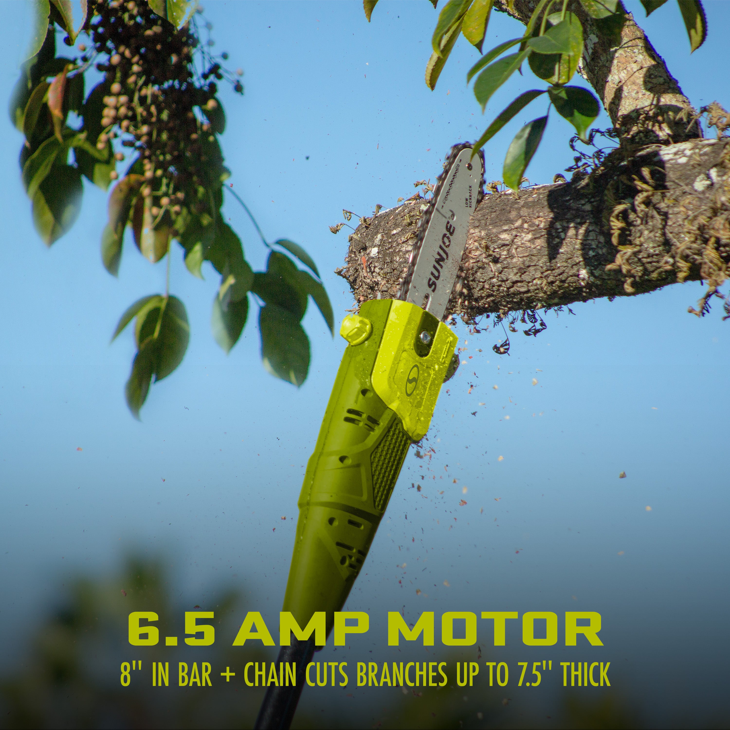 Sun Joe 6.5-amp 8-inch Electric Pole Chain Saw cutting a branch.