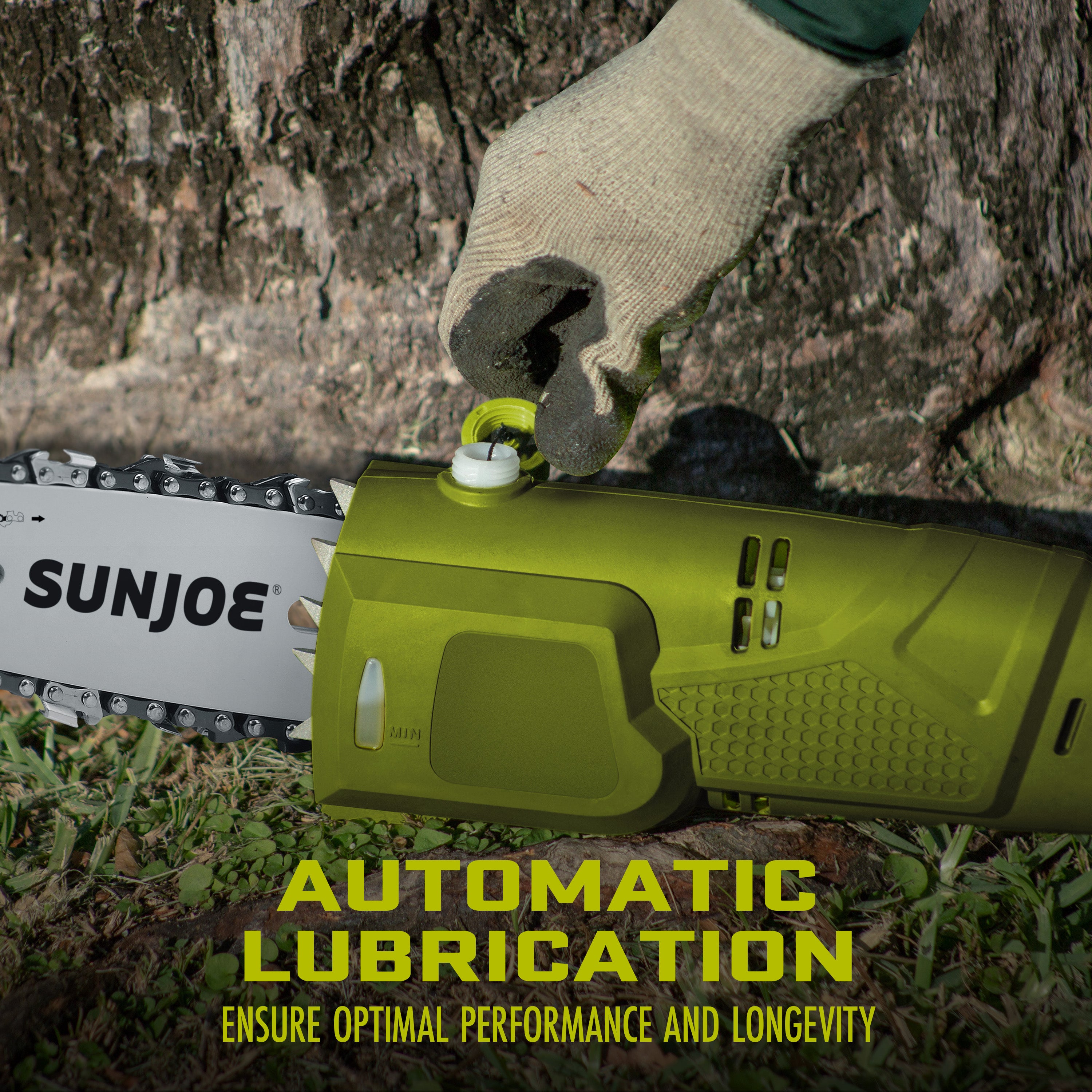• 8-INCH CUTTING CAPACITY: Sun Joe bar and chain with automatic lubrication for smooth operation
