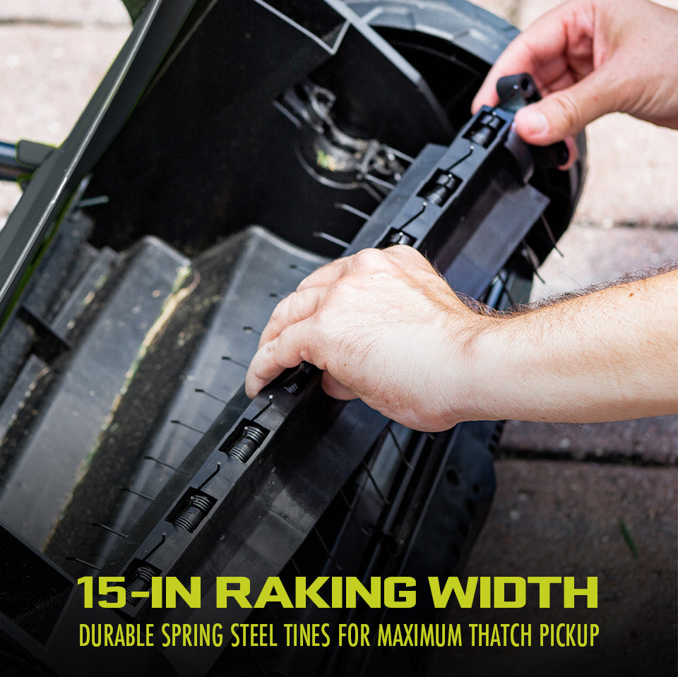 LET YOUR LAWN BREATHE. Get a picture-perfect lawn with the 15-inch Electric Scarifier + Dethatcher from Sun Joe®. Noticing dry, browning patches on your lawn; and watering just isn't cutting it? You've probably got thatch build-up! Scarifying your lawn at regular intervals cuts grass roots and encourages growth for thicker, healthier turf. And regularly using a dethatcher helps cut down on dense masses of roots, stems, and grass clipping that build-up over time.