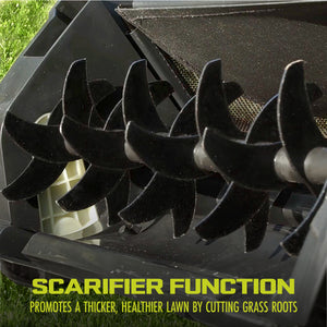 - Scarifier function to cut grass roots for thicker growth, healthier lawns
