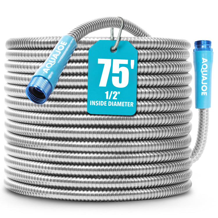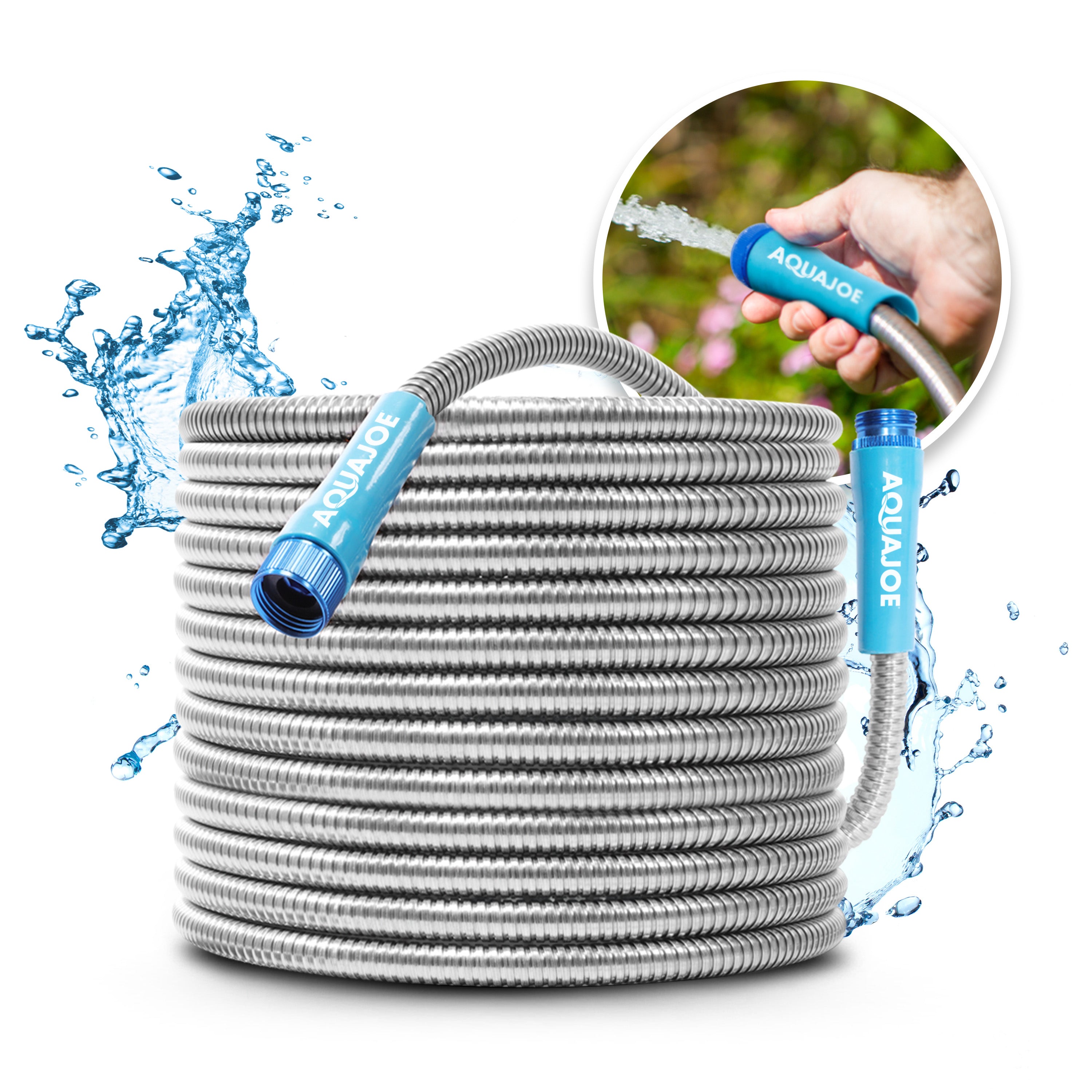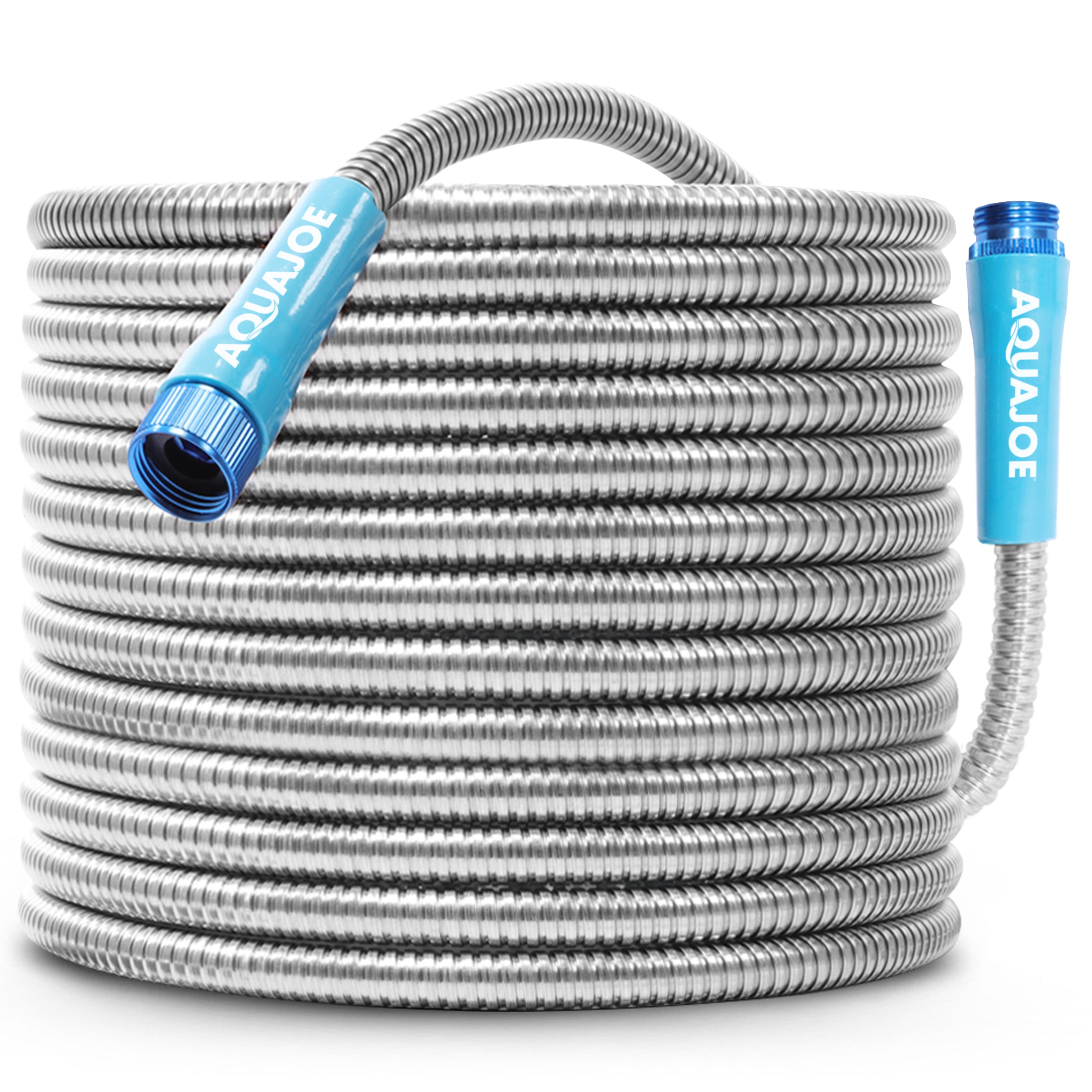 THE STAINLESS STEEL HOSE THAT’S AS TOUGH AS NAILS! AQUA JOE’s lightweight stainless steel hose is quite simply the last hose you’ll ever need! Made from high-quality industrial grade 304 stainless steel for a lifetime of reliable use in your yard and garden. Won’t cut, crush or crack - won’t split, kink or get hot in the sun. It’s the one hose that works as hard as you do. A rugged, virtually indestructible and puncture-proof stainless steel outer sheath surrounds a flexible PVC inner core, for maximum performance and durability, and features bend restrictor collars and durable aluminum fittings at each end for unrestricted water flow and secure, leak-proof connections. Lead-free, phthalate-free and BPA-free. Perfect for watering the flowers, washing the truck, rinsing patio furniture or connecting to sprinkler or pressure washer.