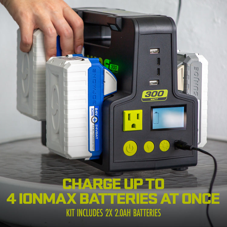 GET CHARGED UP! Take charge of your cordless tools with the 300W 24V MAX Cordless Power Station from SUN JOE®. Designed as a portable inverter + charger Sun Joe works with all 24V IONMAX System batteries, and other rechargeable electronic devices. This power-packed, multi-port power station works to quickly recharge your batteries + devices, so you can get back to work faster and more efficiently than ever. Just connect the battery or device (sold separately) to one of the charging stations or receptacles, and get powered up!