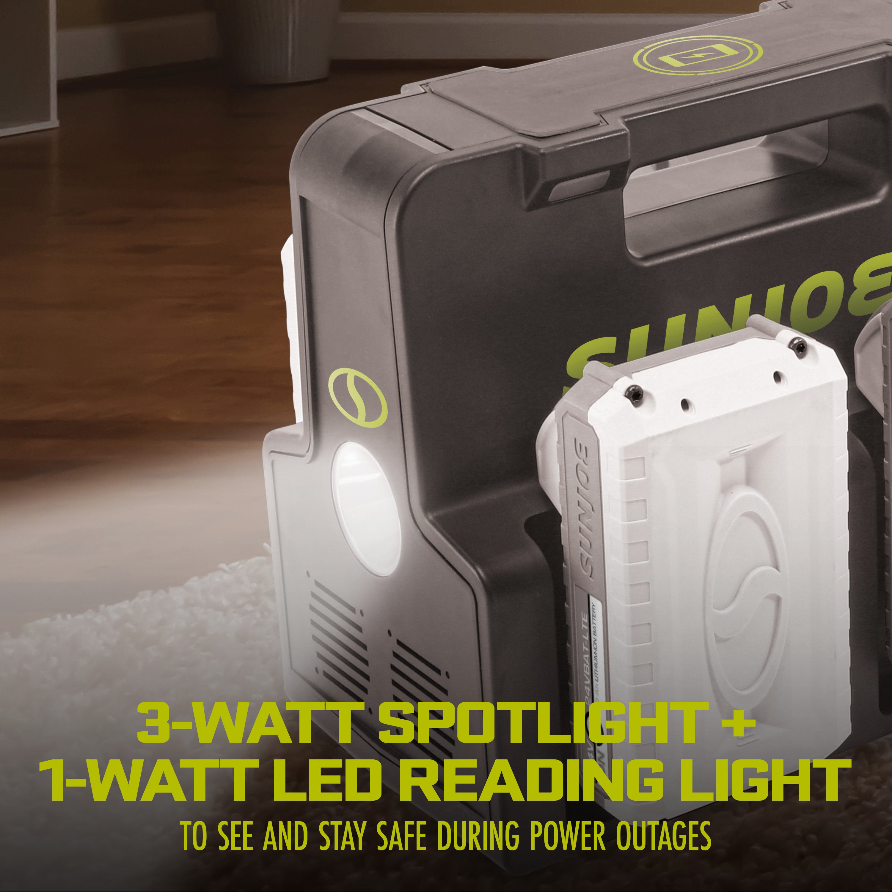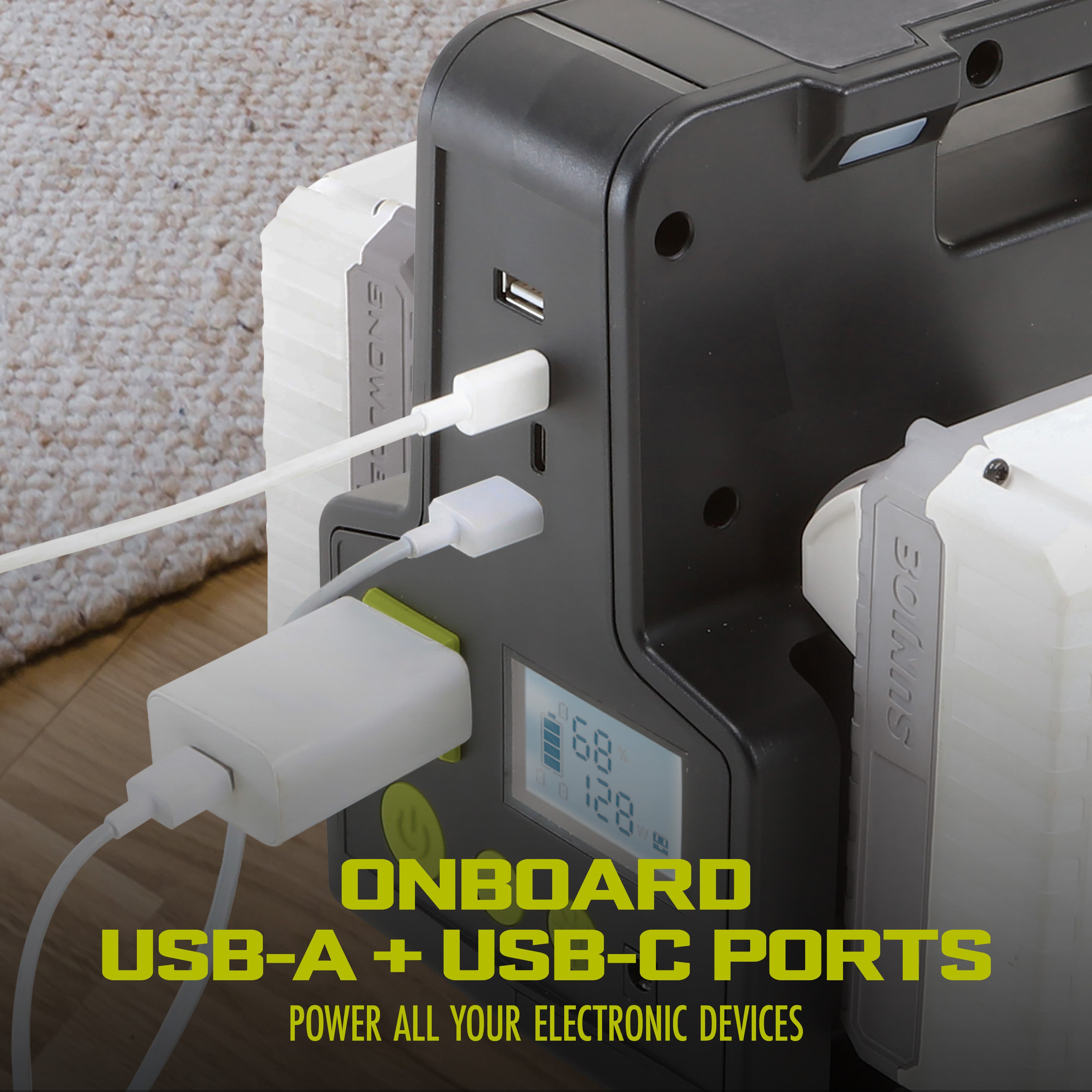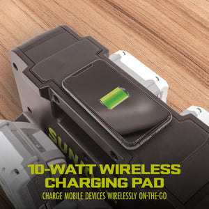 Equipped with an onboard AC outlet, USB-A and -C ports, a 10 W wireless charging pad, and a built-in reading light + spotlight for added safety, this all-in-one station has everything you'll need to get back to work. Charge up to 4 IONMAX batteries (sold separately), a laptop, a tablet, and e-reader, and a phone all at once, so you can keep your life running on-the-go. The Cordless Power Station by Sun Joe provides an eco-friendly means to safely and reliably power your phones, lamps, laptops, small appliances – ideal for camping, boat, tailgating and power outages. One station, countless cordless possibilities! GET EQUIPPED®.
